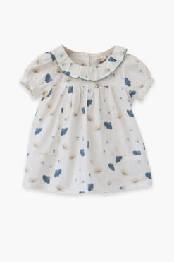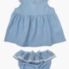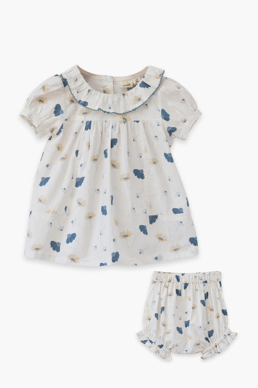 Baby Set in Blue Floral is an adorable bay set that includes a matching baby top with a ruffle collar and matching bloomer. 100% cotton, machine wash.