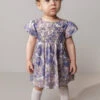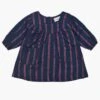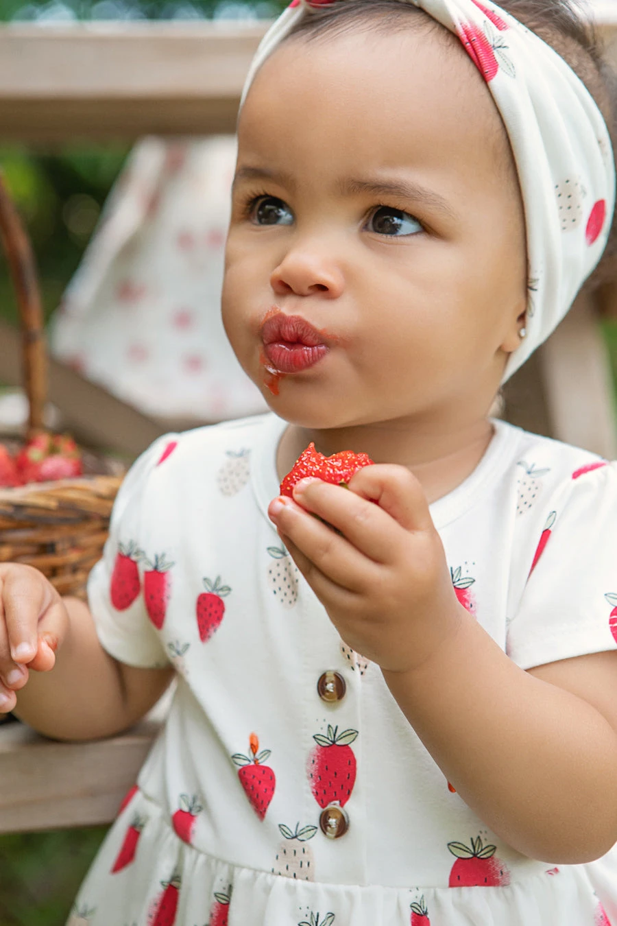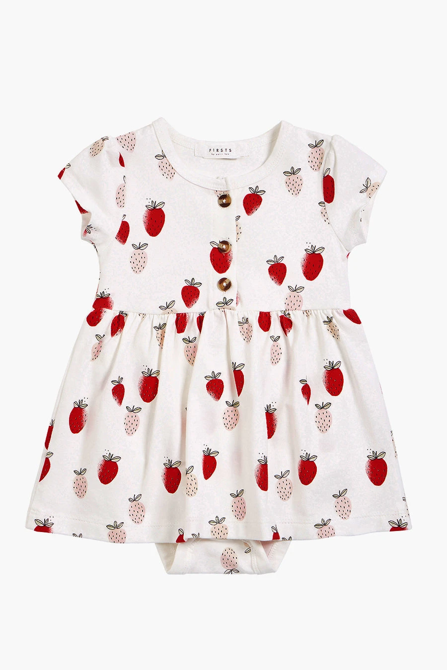 in an allover strawberry print featuring an attached diaper cover with snaps at the inseam for easy