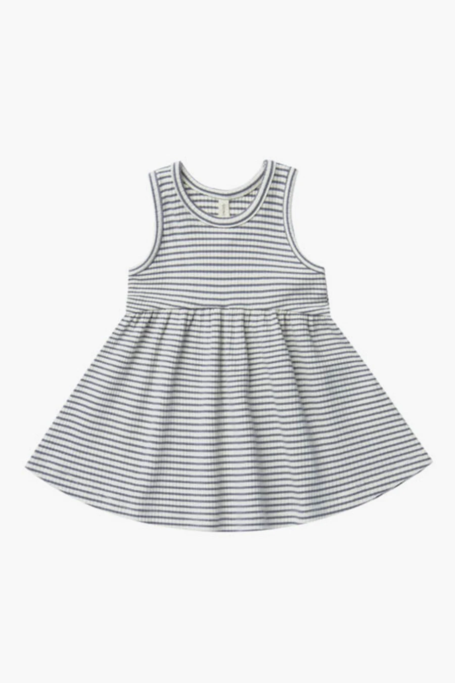features a fitted top and a flowy bottom in a ribbed material and an indigo stripe pattern. 100%