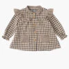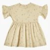 ruffle cap sleeves and front pockets. Made with buttons below the neckline and on the bottom for easy baby wear. Made in 100% cotton, machine wash.