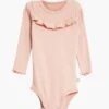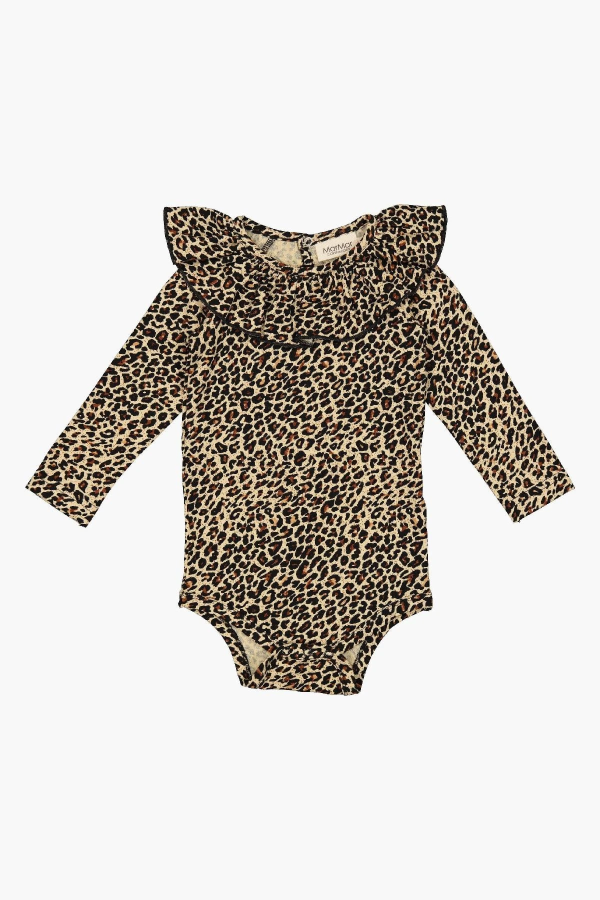 leopard print. Features a ruffle collar, long sleeves and snap closures for easy