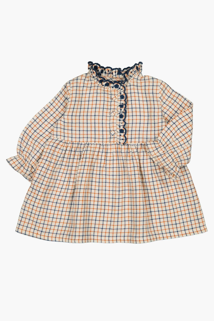 checkered print with a cream colored base. It has three buttons down the front with a delicate scalloped edge along the neckline and down to the waist seam. The cuffs have a subtle