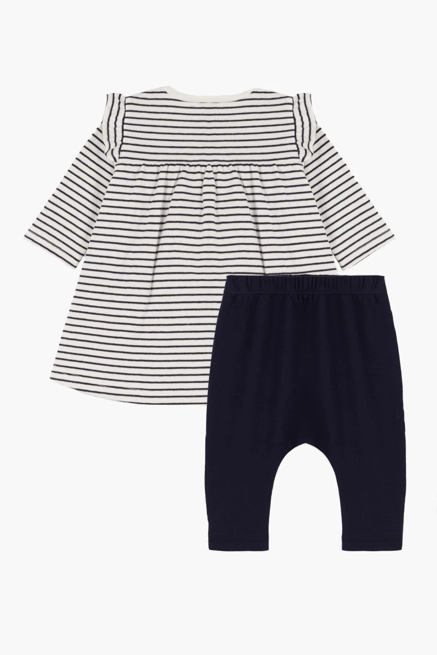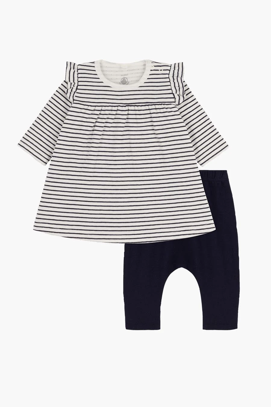 combination. The dress features delicate ruffles on the shoulders and a classic A-line shape. The leggings are made with a dropped inseam for easy