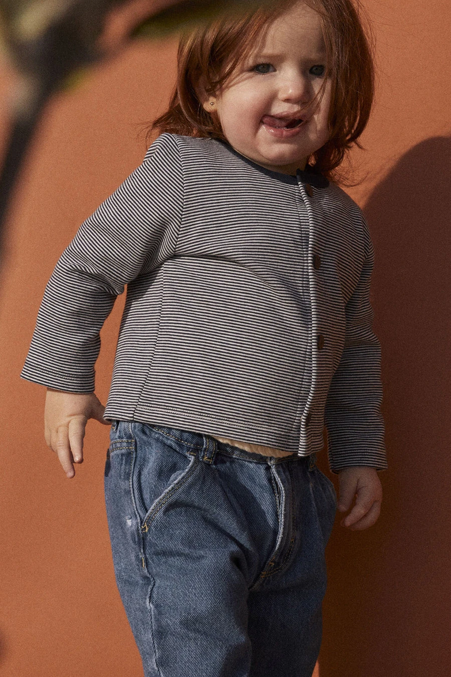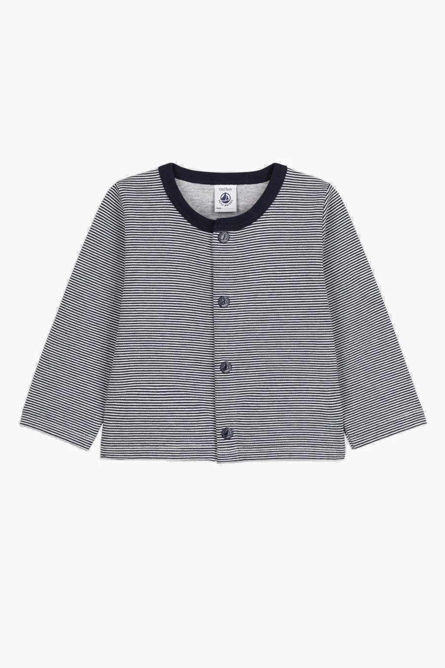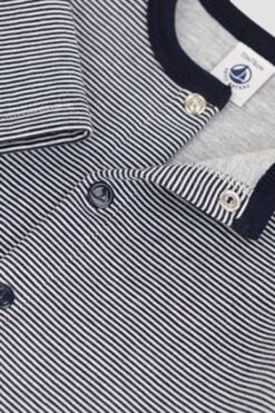 . Featuring a narrow black and white striped pattern, a black trimmed collar and four pretty buttons down the front for easy