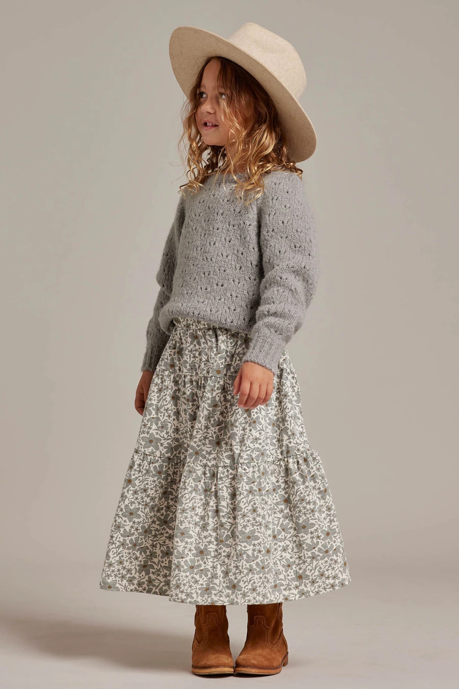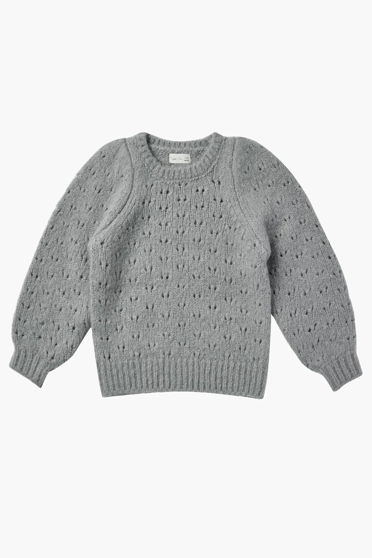 , intricate pointelle pattern. It features a ribbed neckline, cuffs, and bottom hem. Pair with favorite denim or