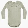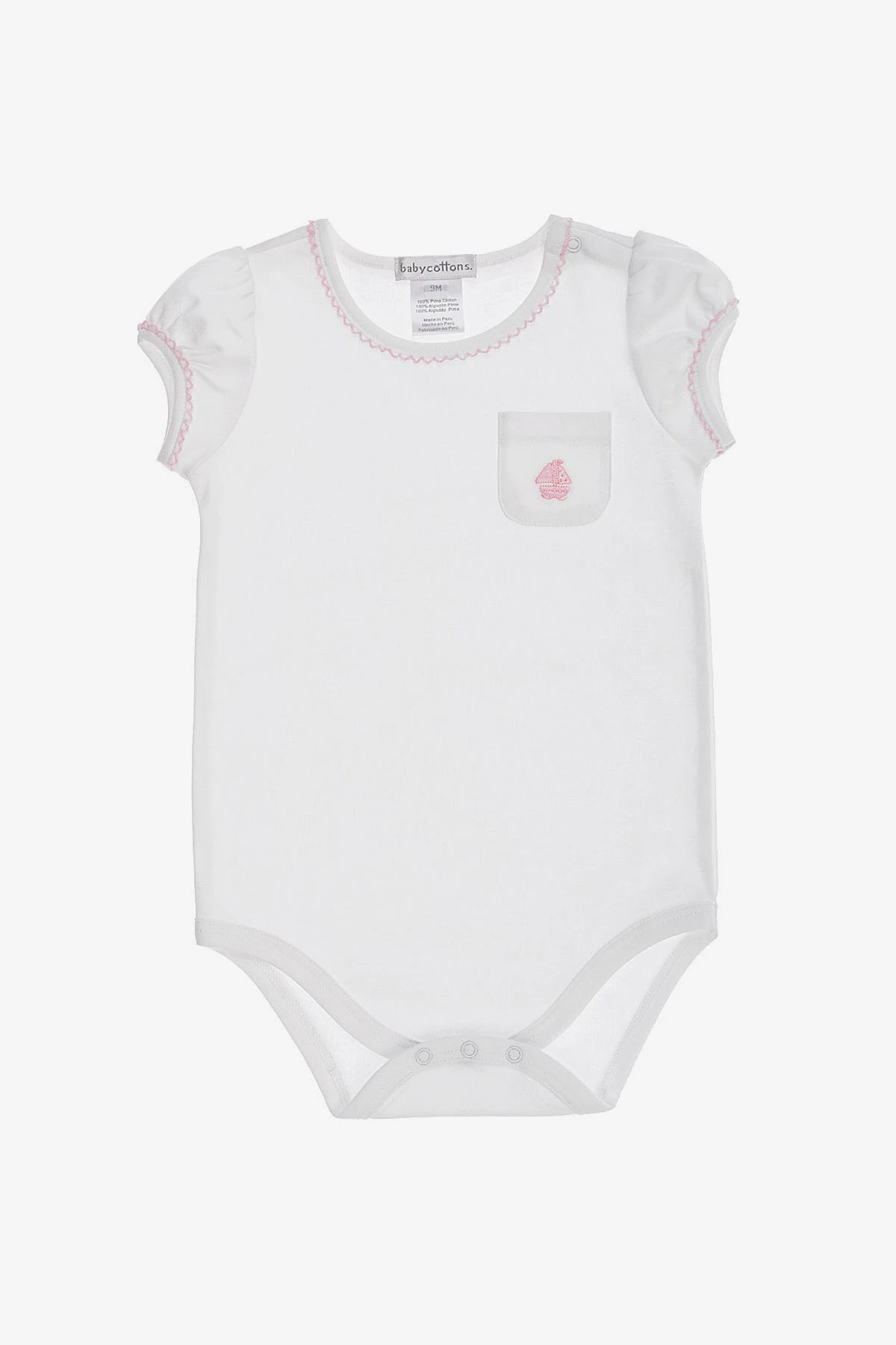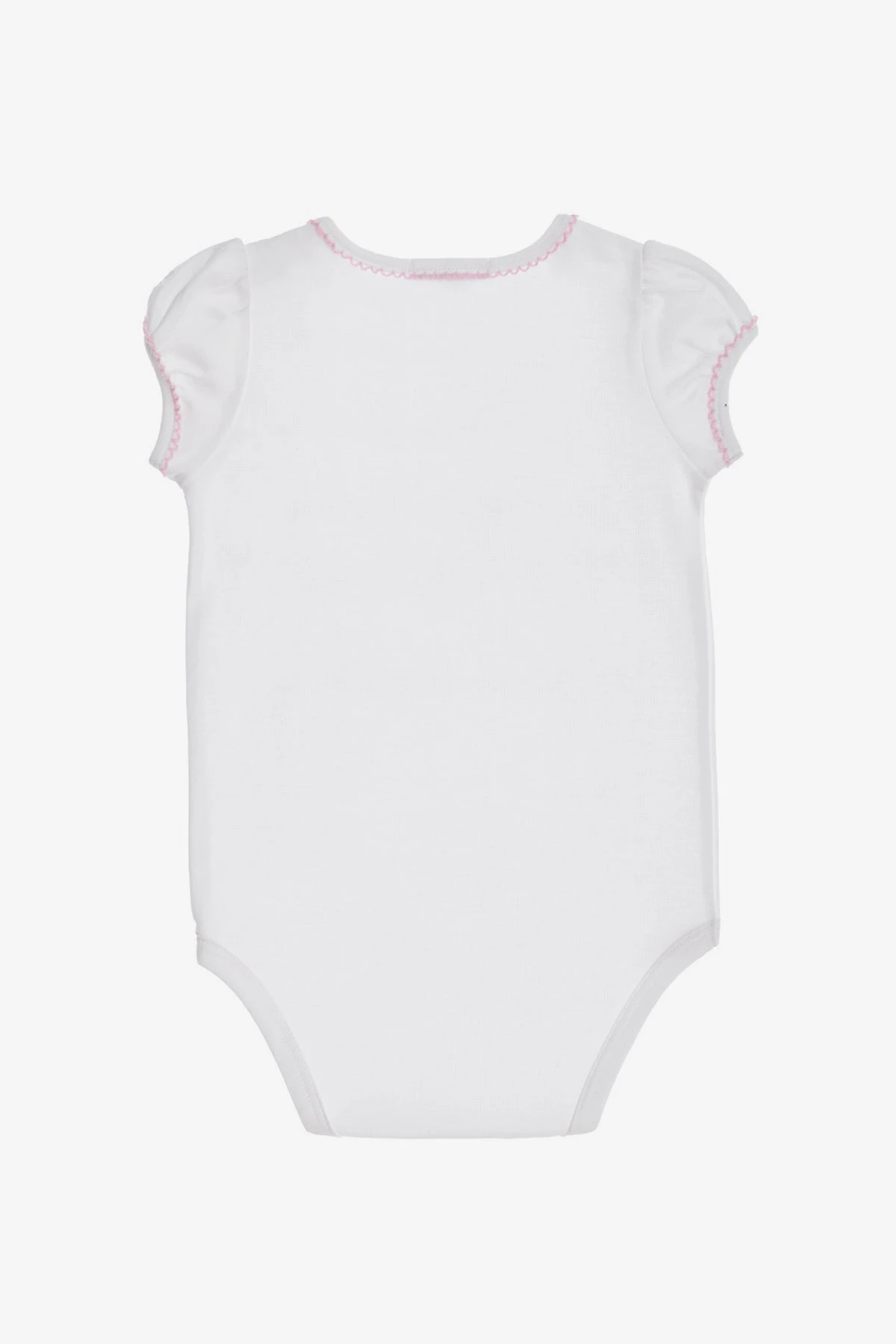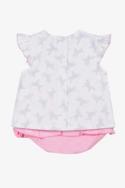 with a ruffled neckline and puff sleeves. Snaps at the back and inseam for easy