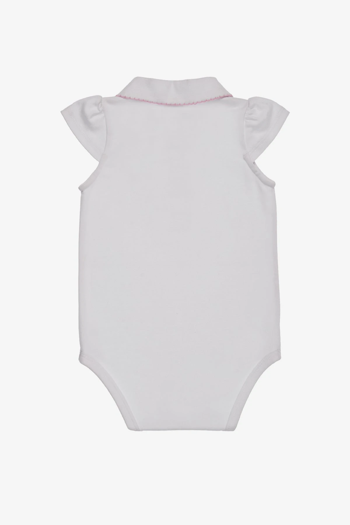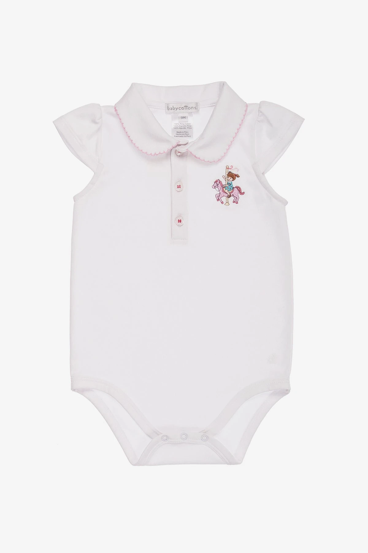 features a collar with pink trim, a carousel applique and snaps on the inseam for easy