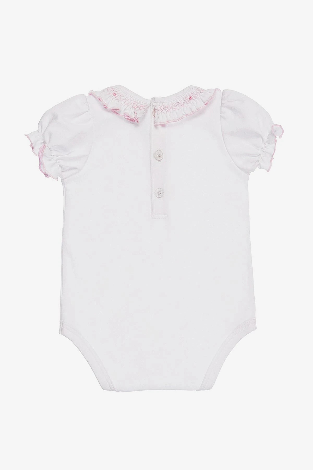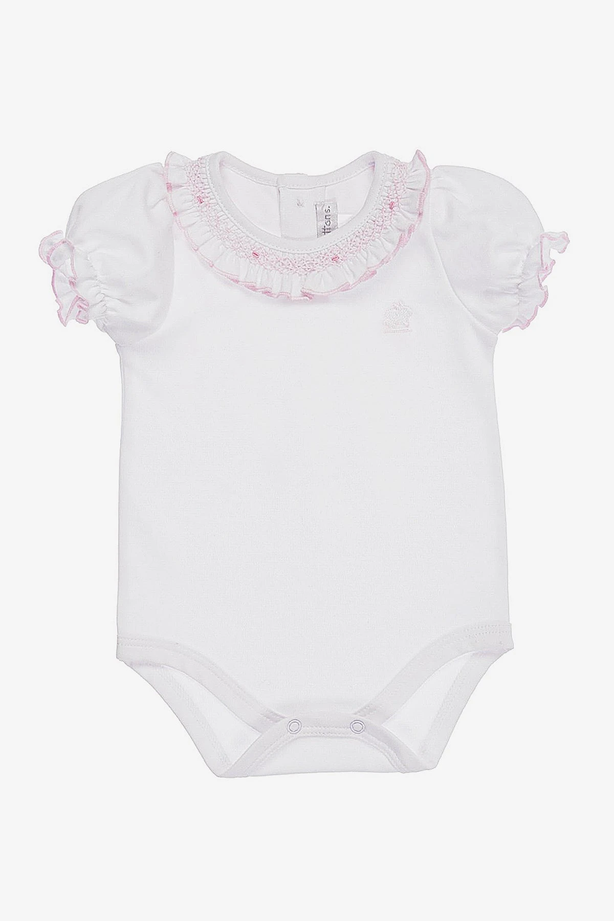 with a ruffled neckline and puff sleeves. Snaps at the back and inseam for easy