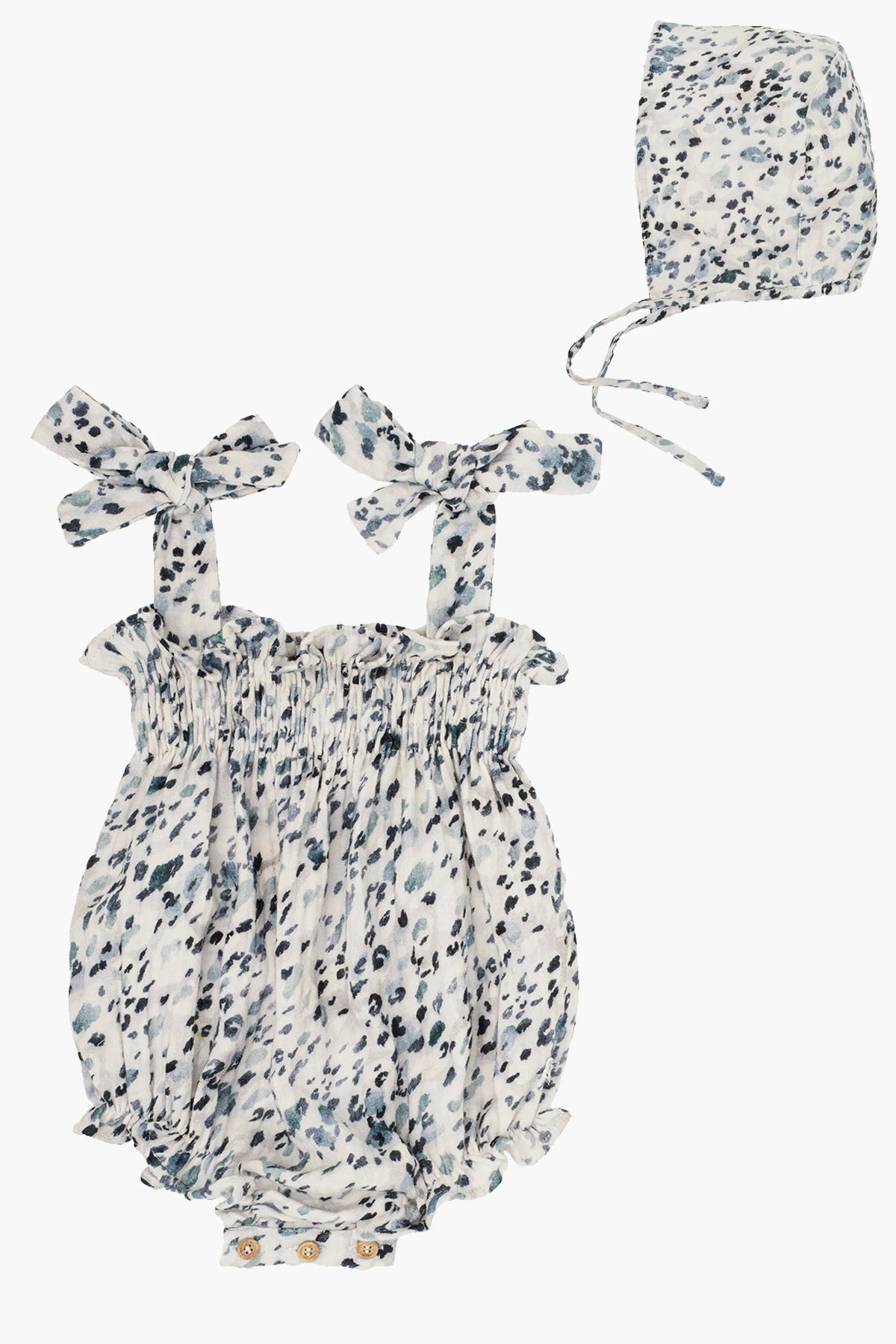 straps that tie on the shoulders to ensure the best fit. This romper features buttons on the bottom for easy baby wear. Made in