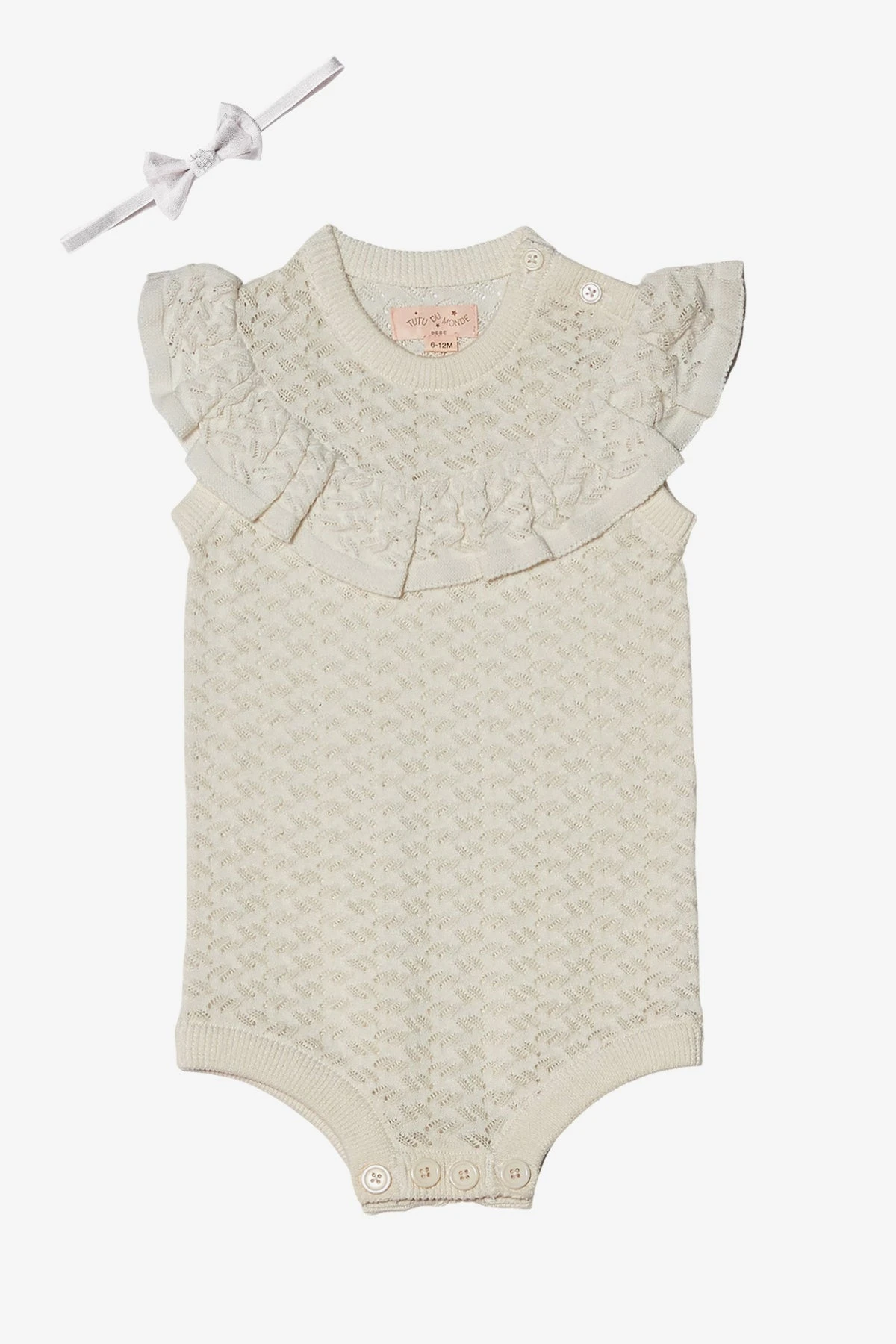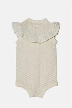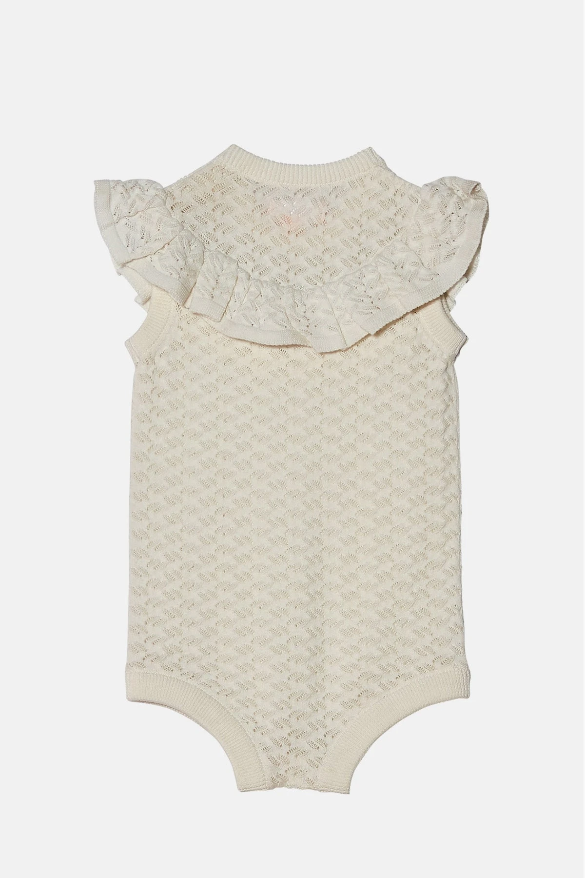 bib ruffle, a button closure at the inseam and along the shoulder for easy