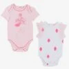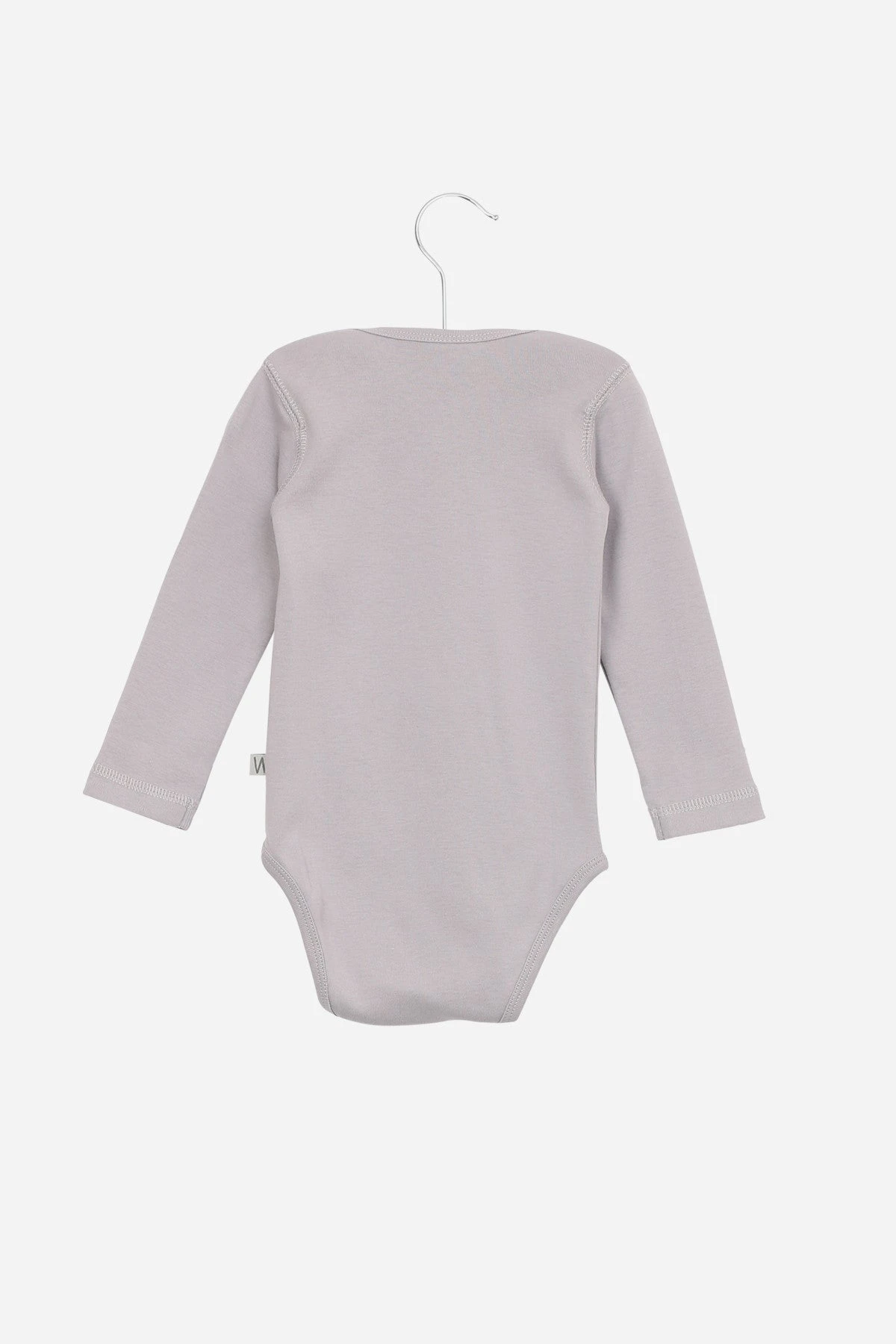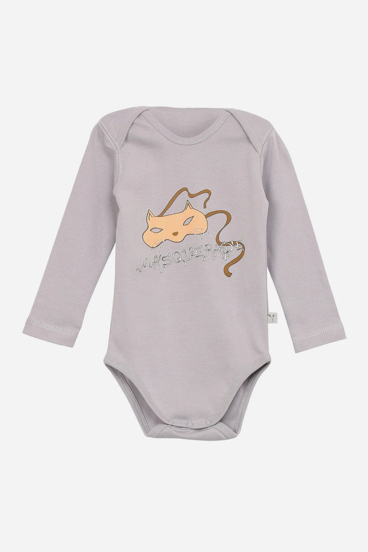 girls onesie by Wheat in a lavender color with a mask print. Snaps at the inseam and foldover shoulders for easy