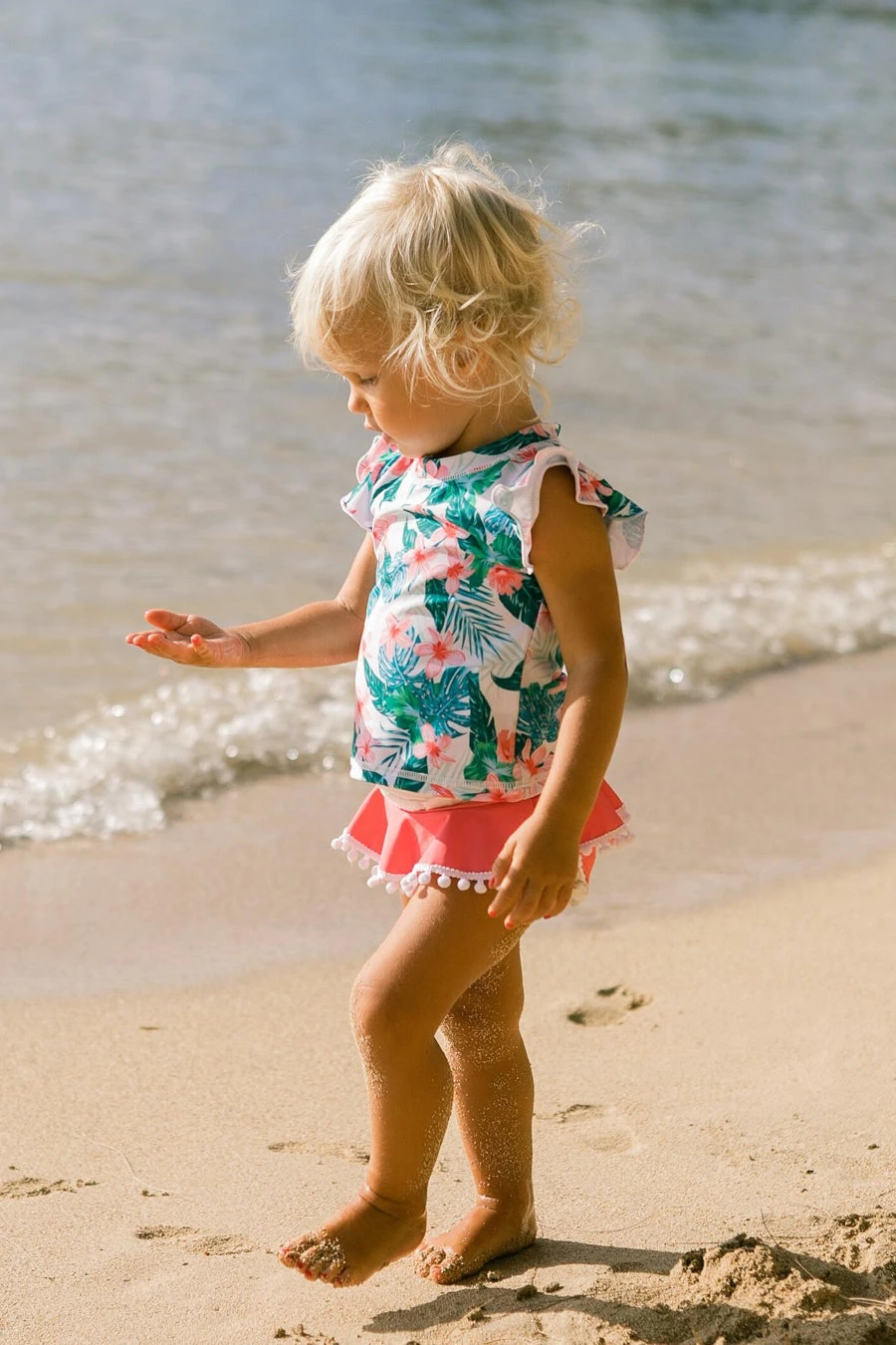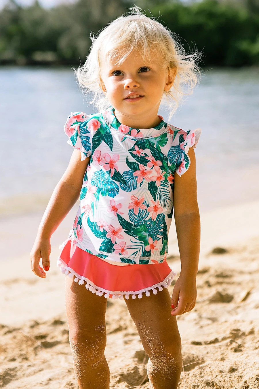 featuring a bold design with ruffle detailing along the top and bottom and UPF 50+ sun protective fabric. 80% nylon, 20% elastane, machine wash cold.