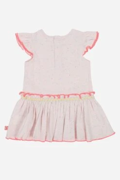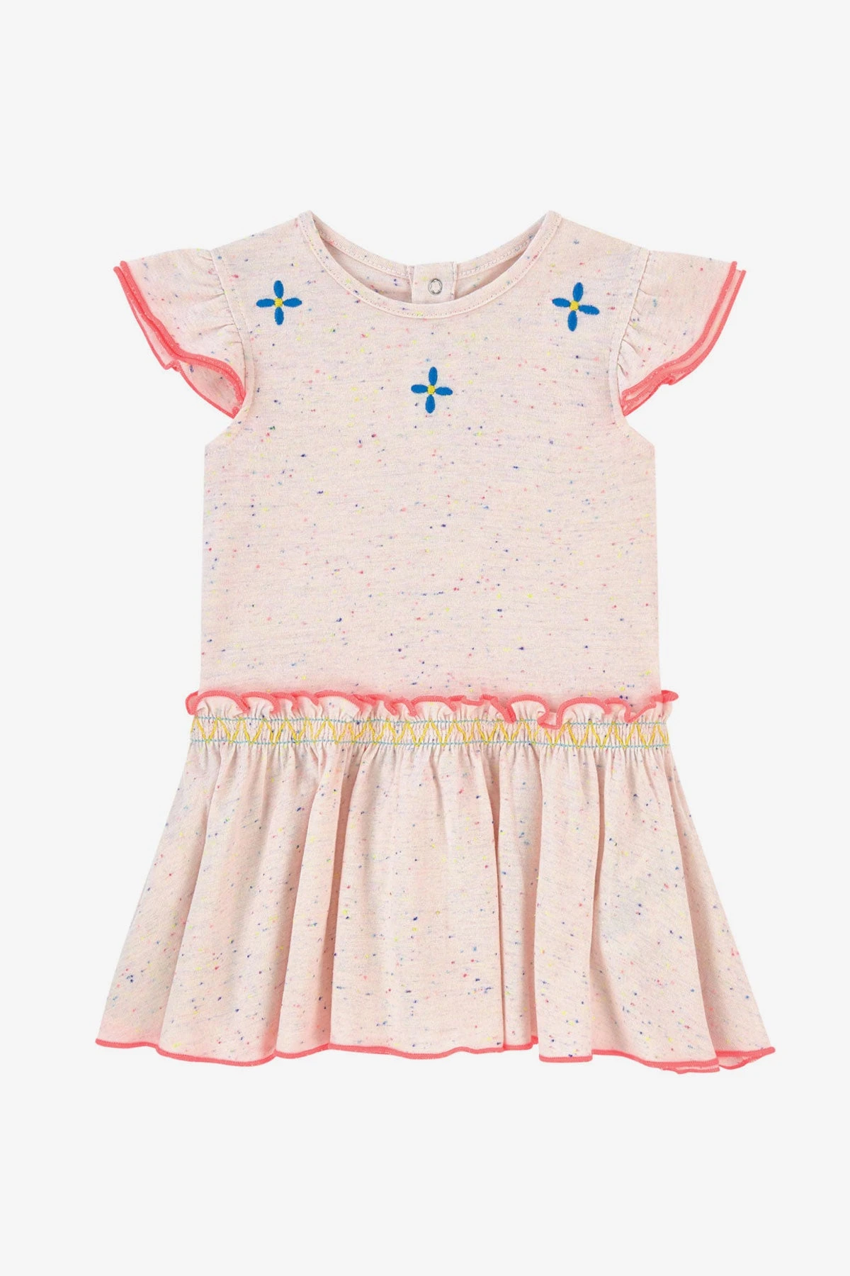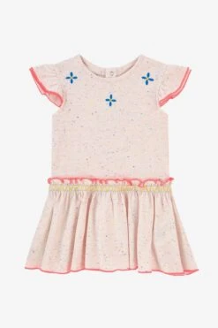 in a light pink heather with contrast piping at the hem, embroidered detail at the waist and blue embroidered flowers at the top. Snap closure at the back. 54% cotton, 46% polyester, machine wash cold.