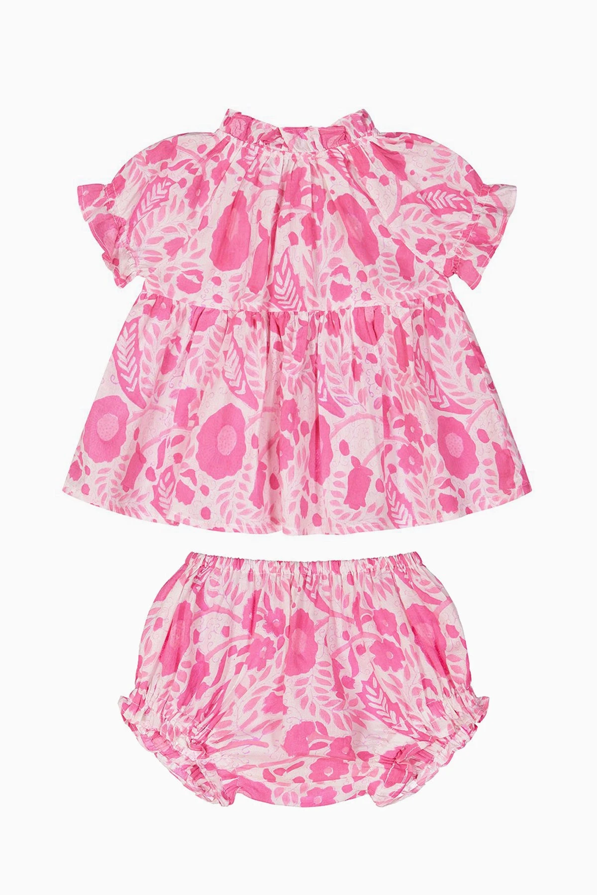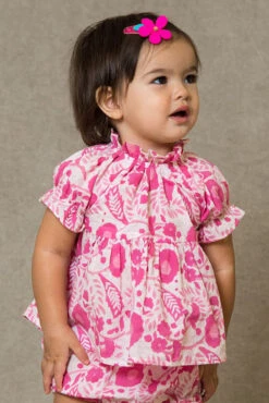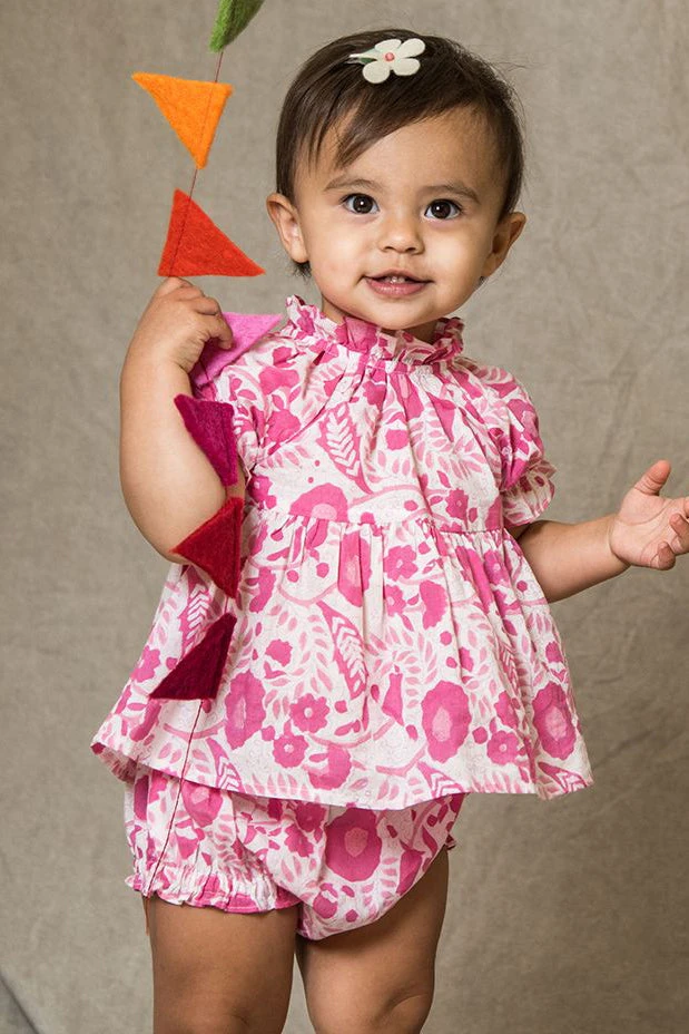 is made in a beautiful rose block print and features a ruffle neck, puff sleeves and an A-line shape while the