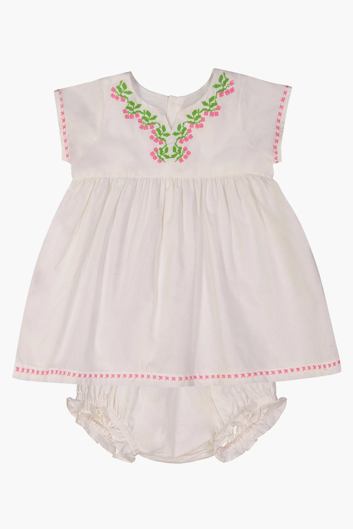 for a warm sunny day. Features a classic shape and floral embroidered trim. The matching bloomers have ruffle trim and elastic openings for added comfort and