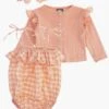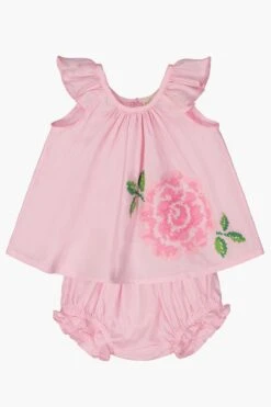 with delicate embroidery. The top features flutter sleeves and the adorable