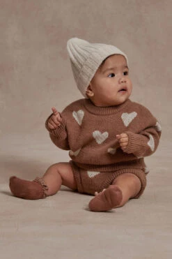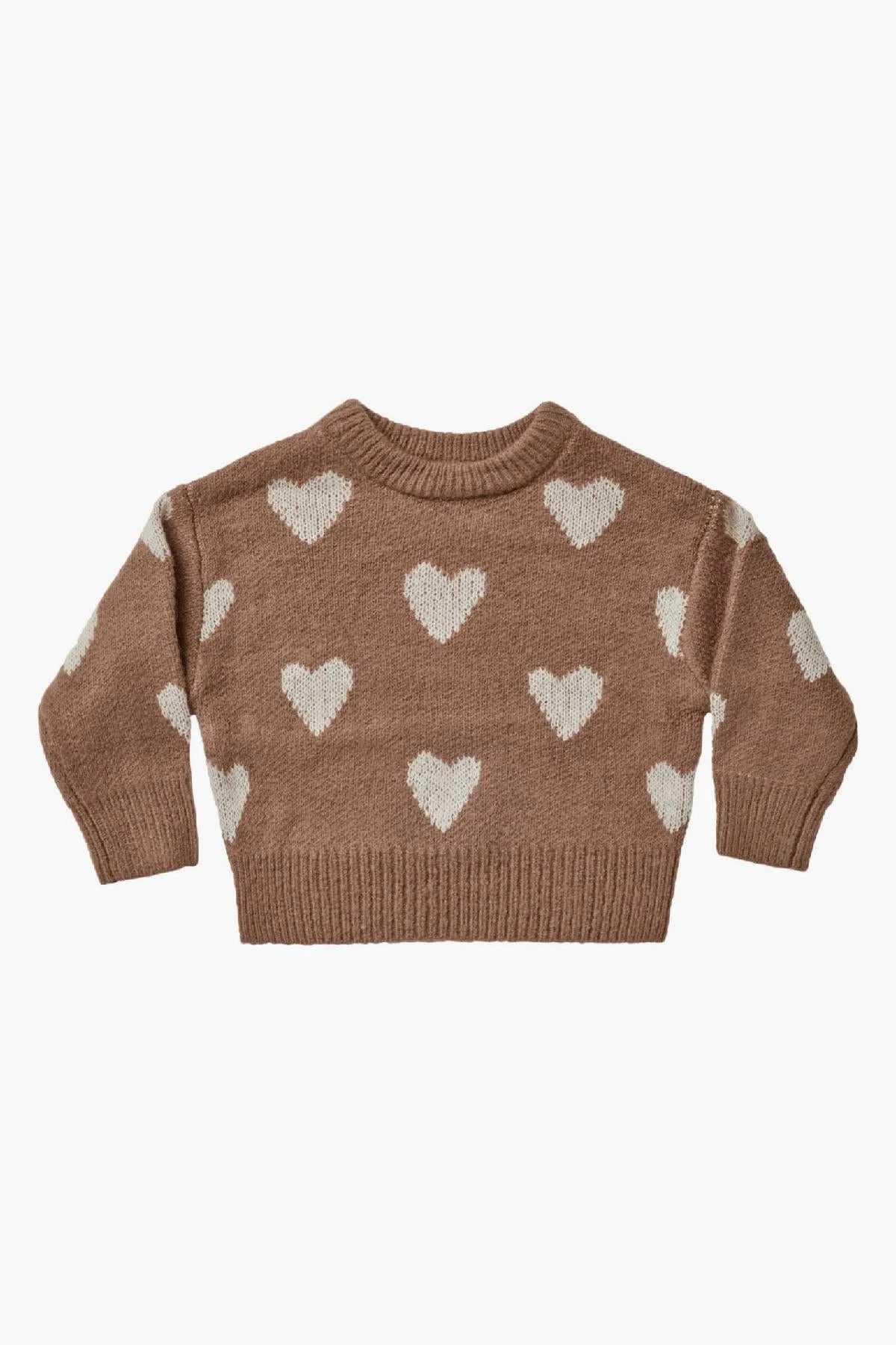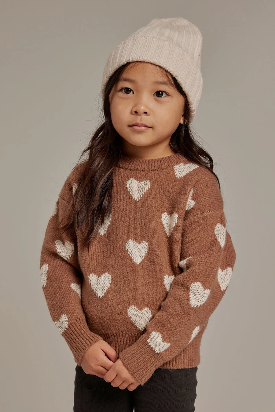 with an all-over hearts pattern. Finished with contrasting ribbed trim at the neckline, cuffs and hem. Pair with favorite