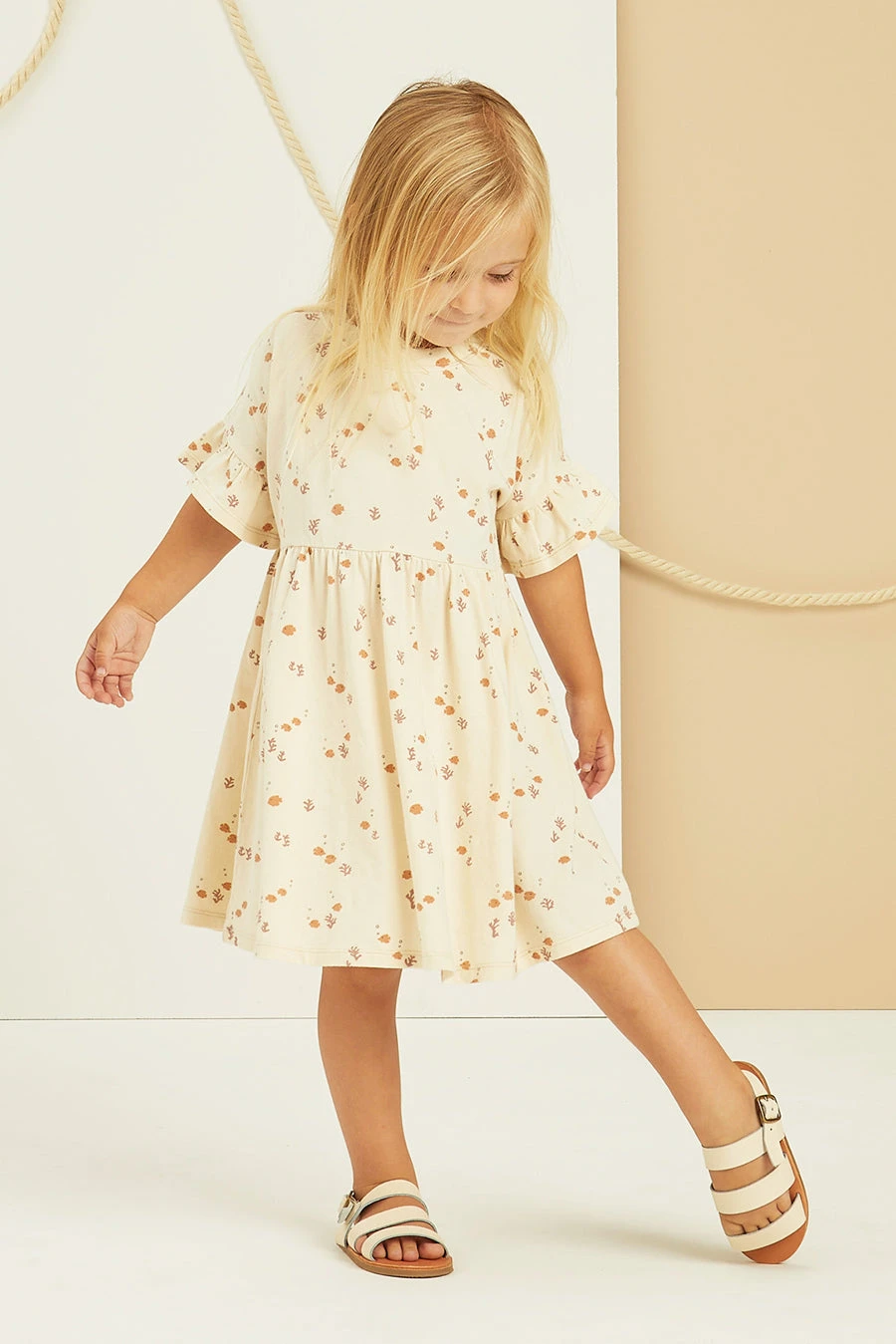 features flutter sleeves, a high neck, and a angelfish theme print.