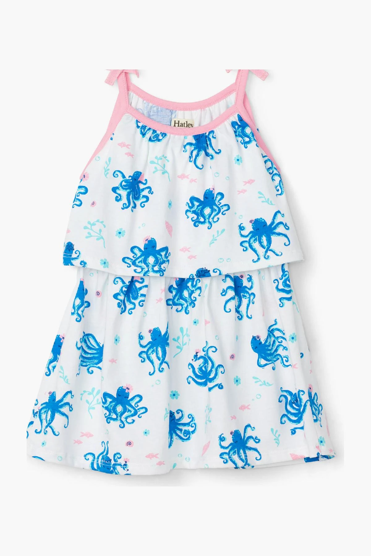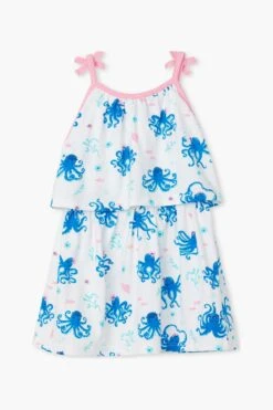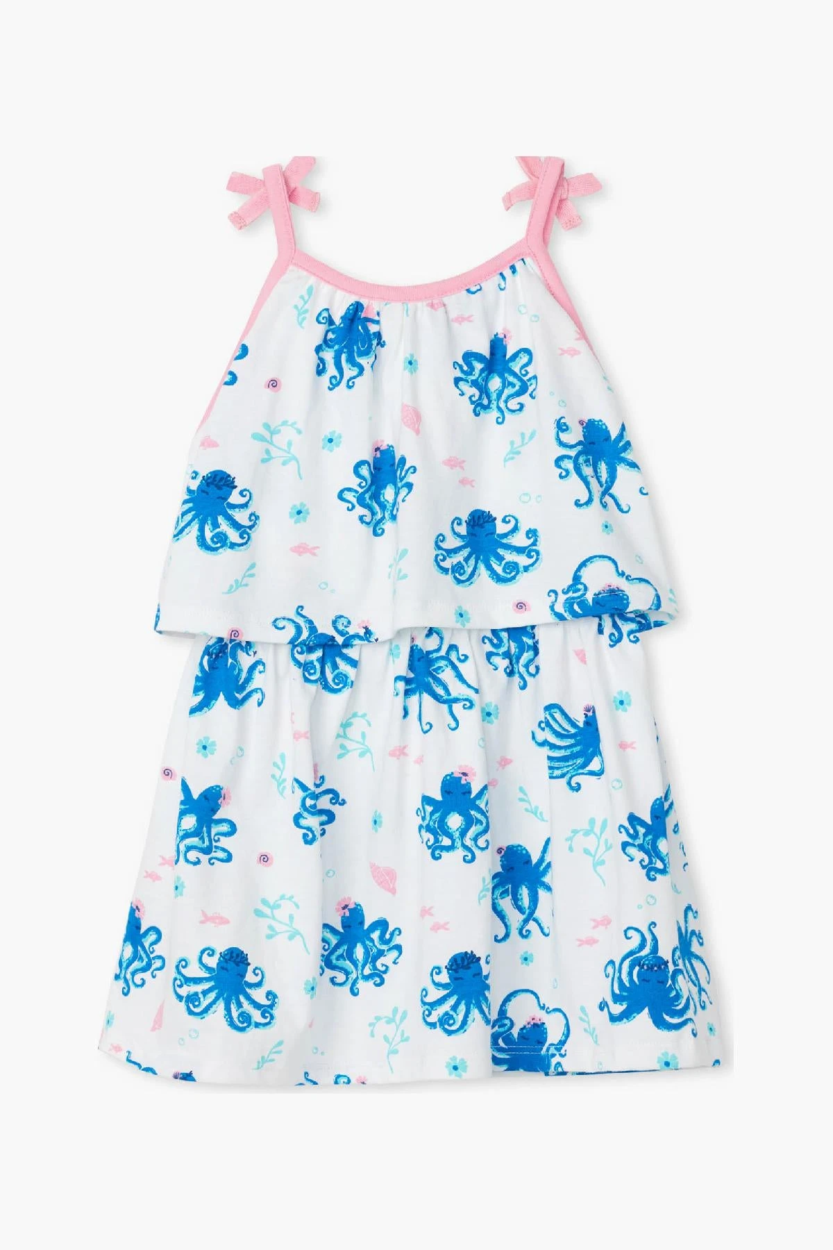 in an allover octopus theme. Features decorative bows on the straps. 100% cotton, machine wash.