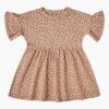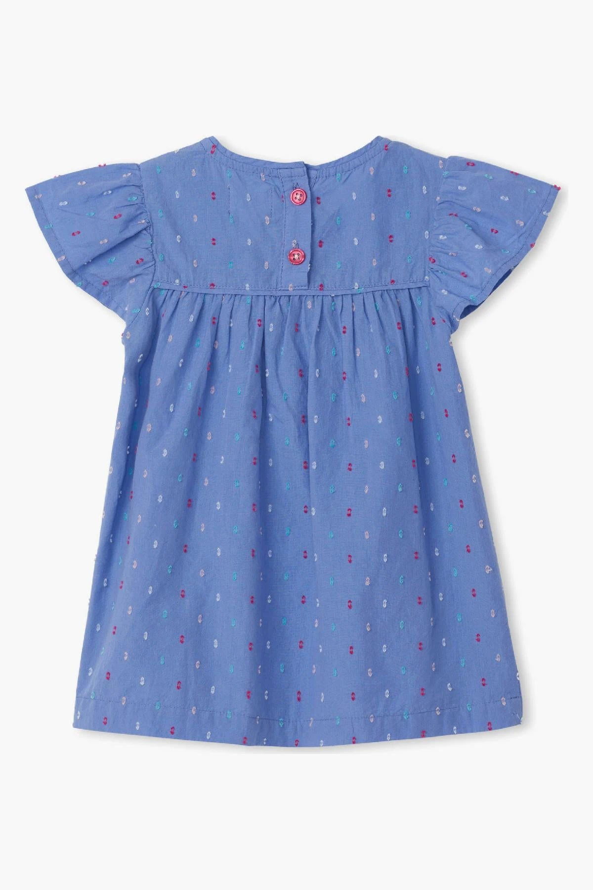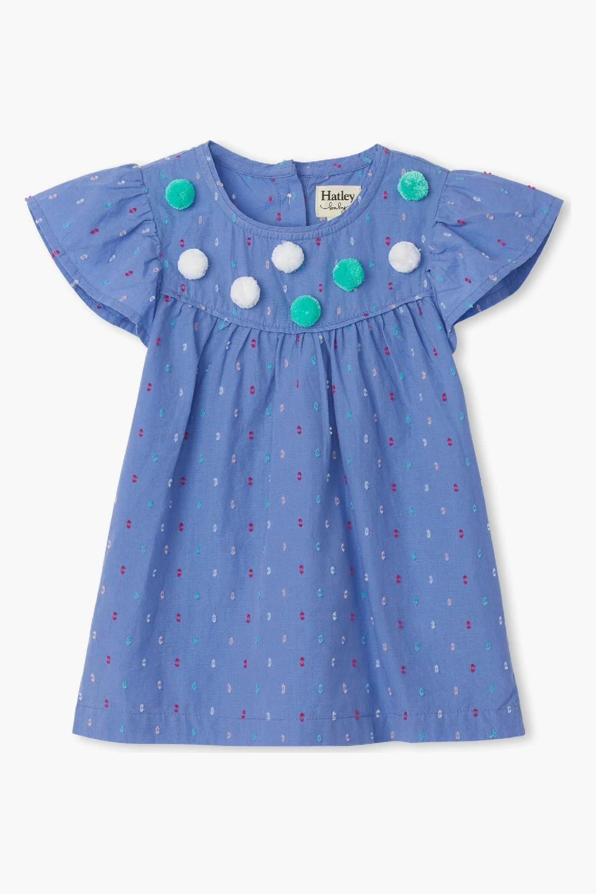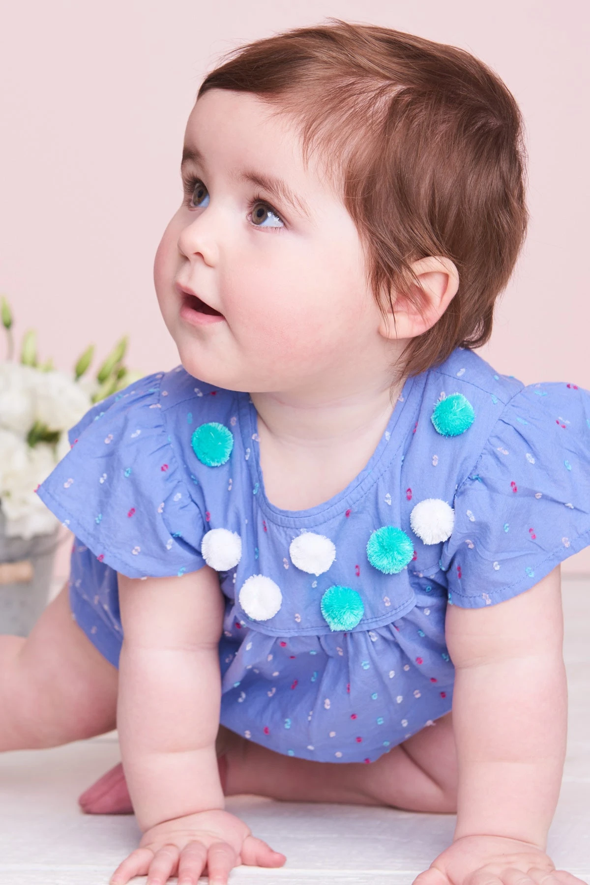 features decorative pom poms, flutter cap sleeves, a two button closure at the back and comes with bloomer
