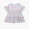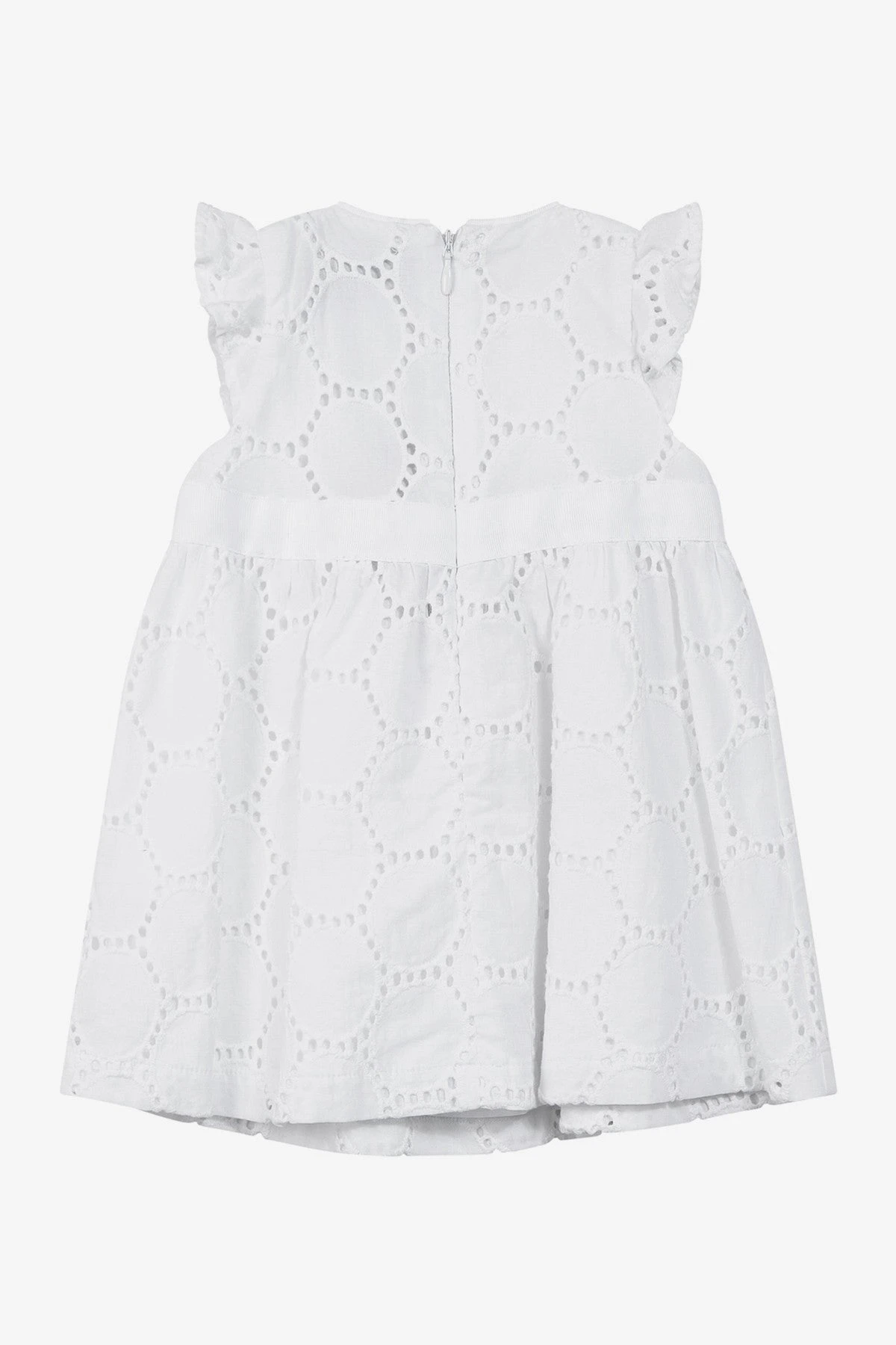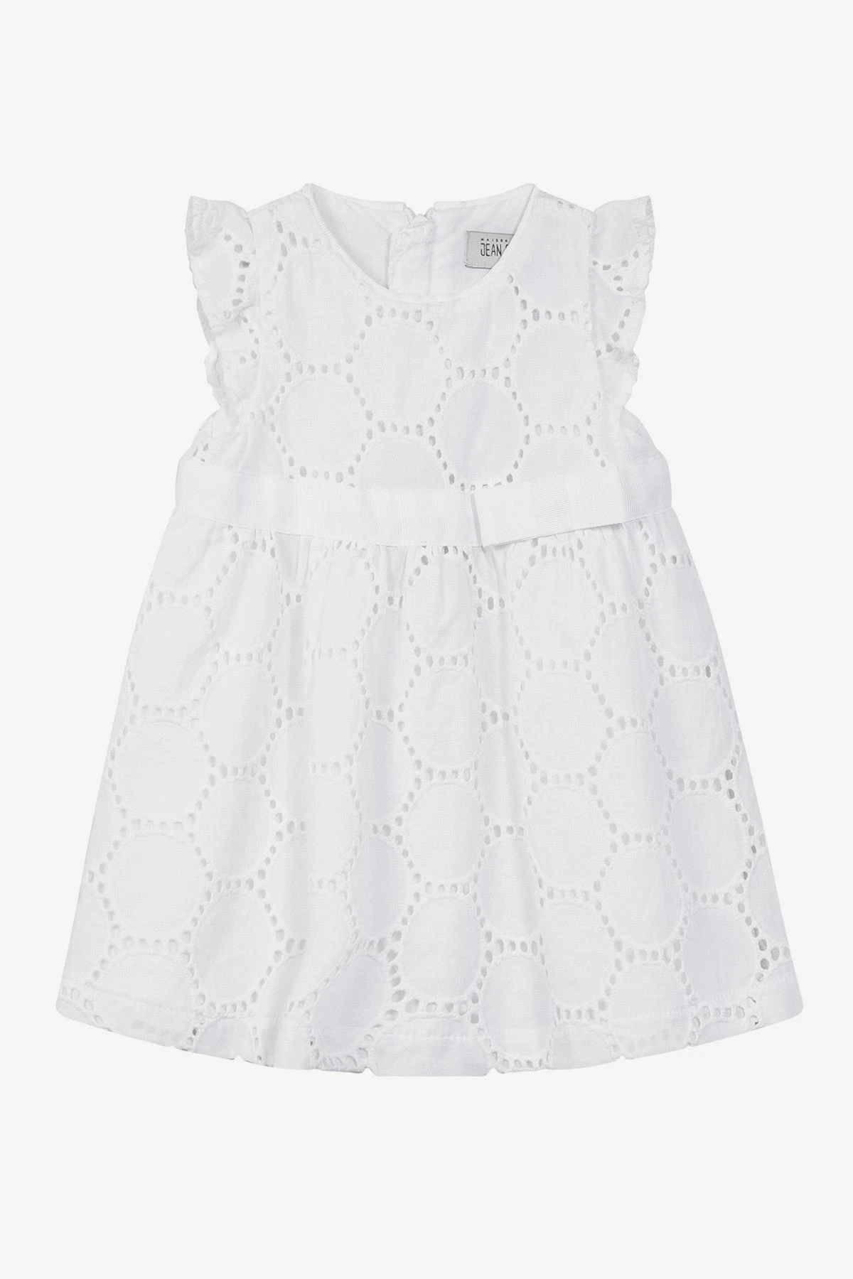perfect for any special occasion. Features flutter sleeves and a grosgrain ribbon and bow around the middle. Zipper back, made in cotton eyelet, fully cotton lined.