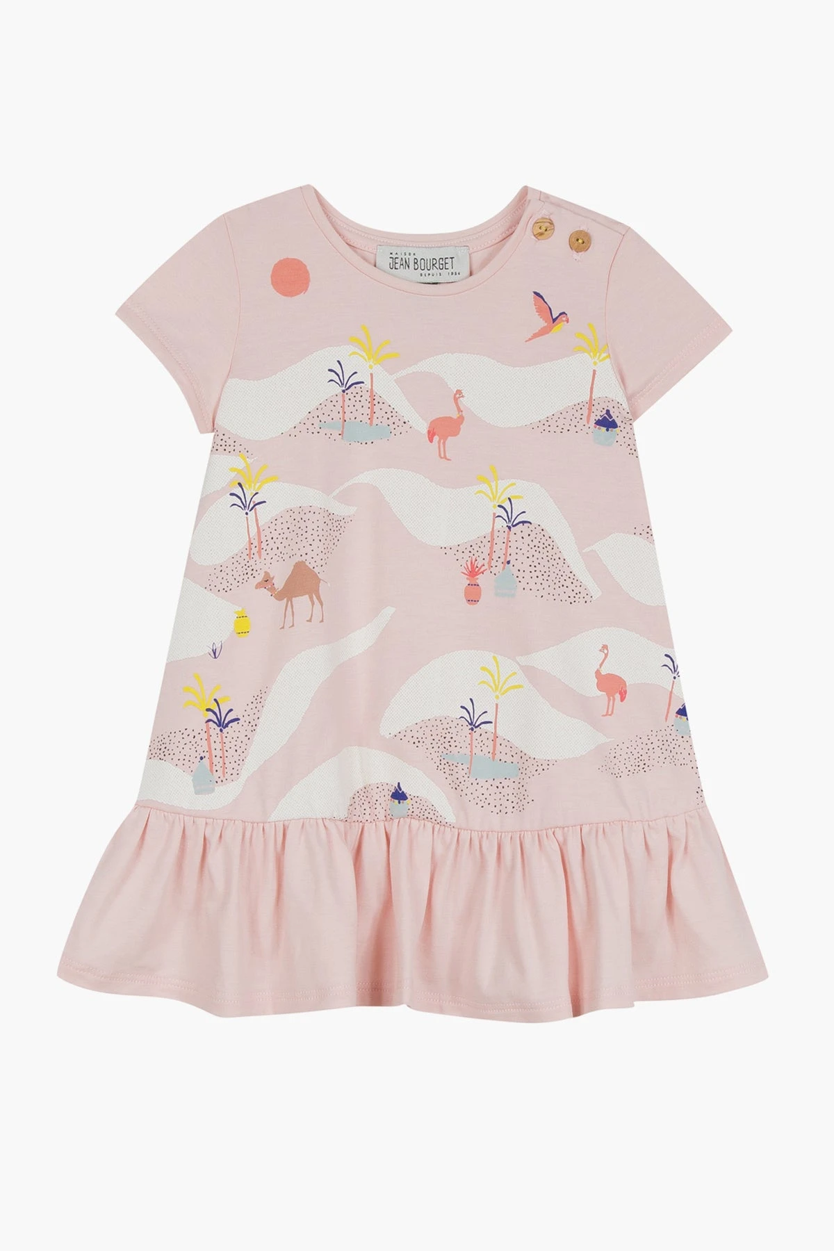 features a wide ruffle around the bottom and buttons at the shoulder for easy