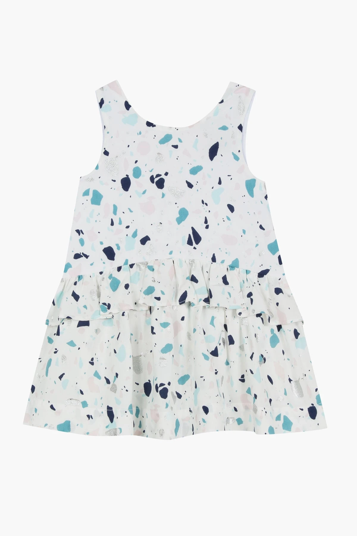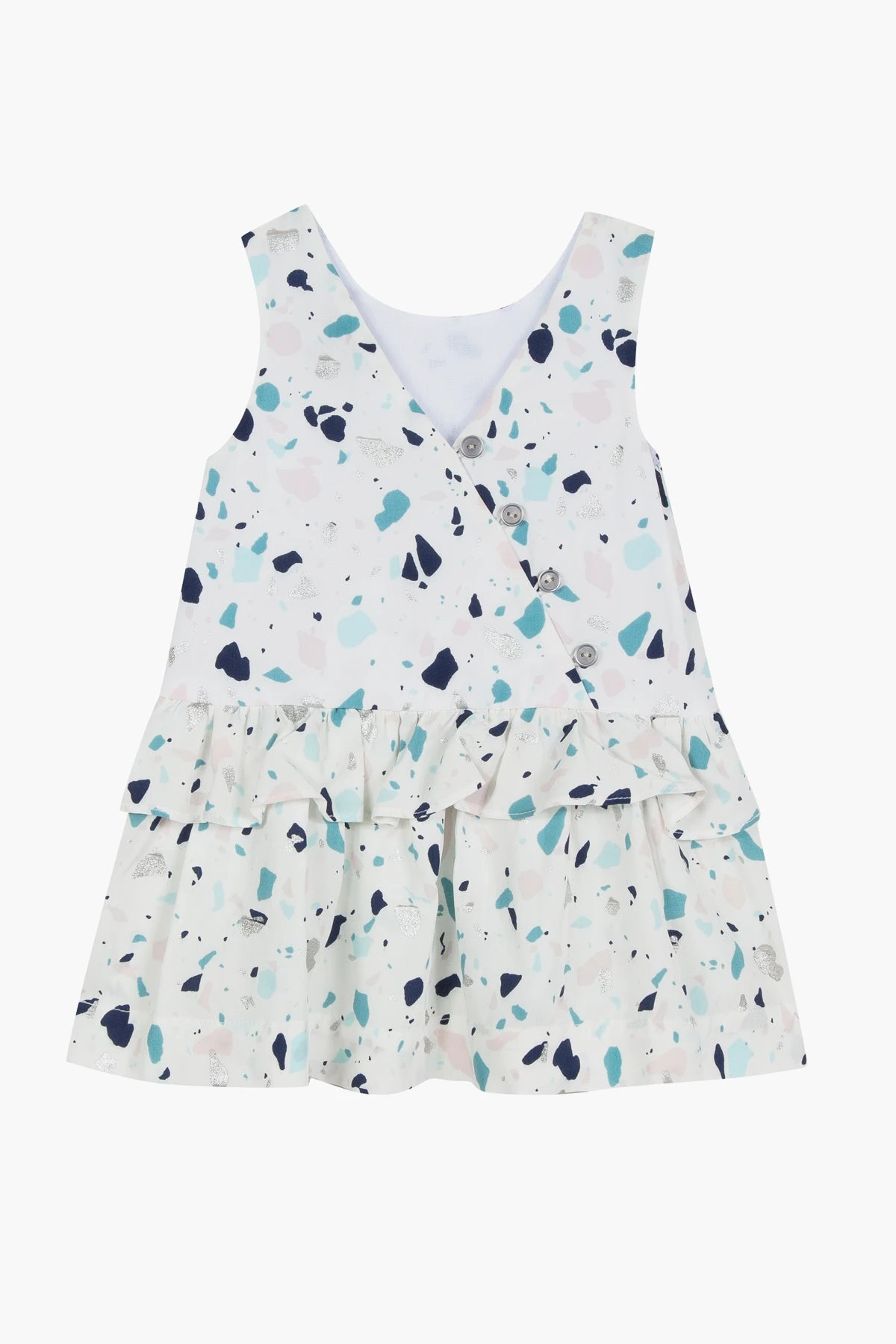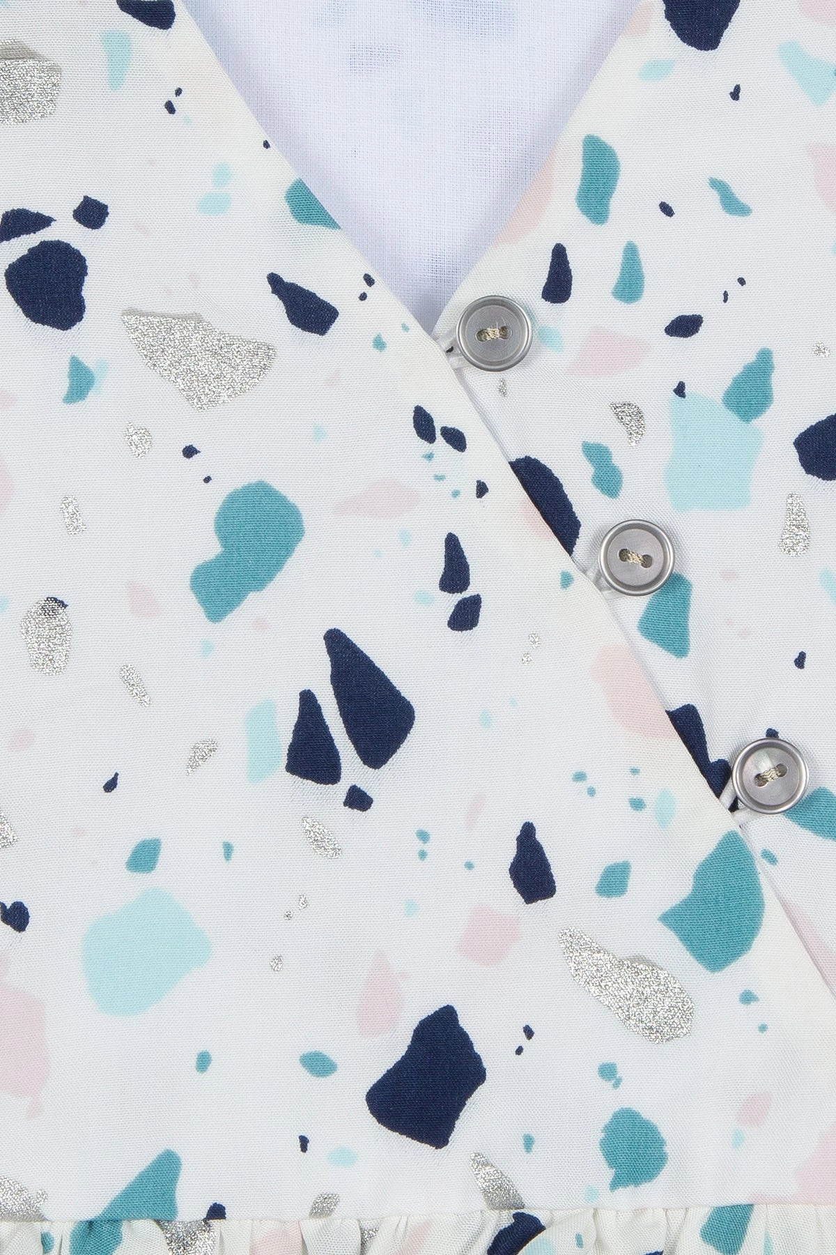 in a splatter print. Features a ruffle around the waist and buttons on the back. 100% viscose, fully cotton lined, machine wash cold.