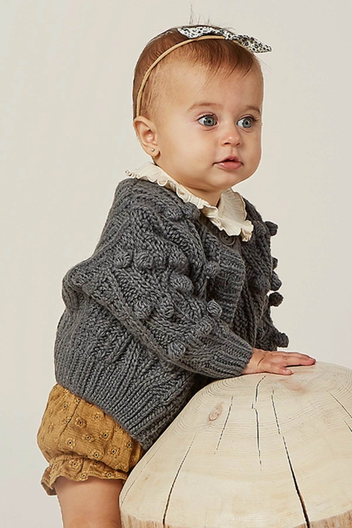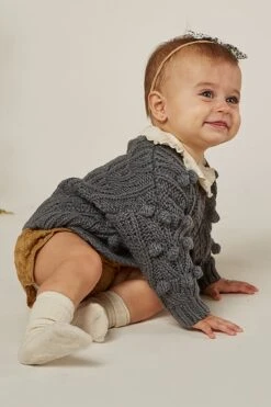 features a button closure, knit poms on the front, a raised collar and rib neckline, waist and cuffs. Made of 80% acrylic, 20% wool, hand wash.