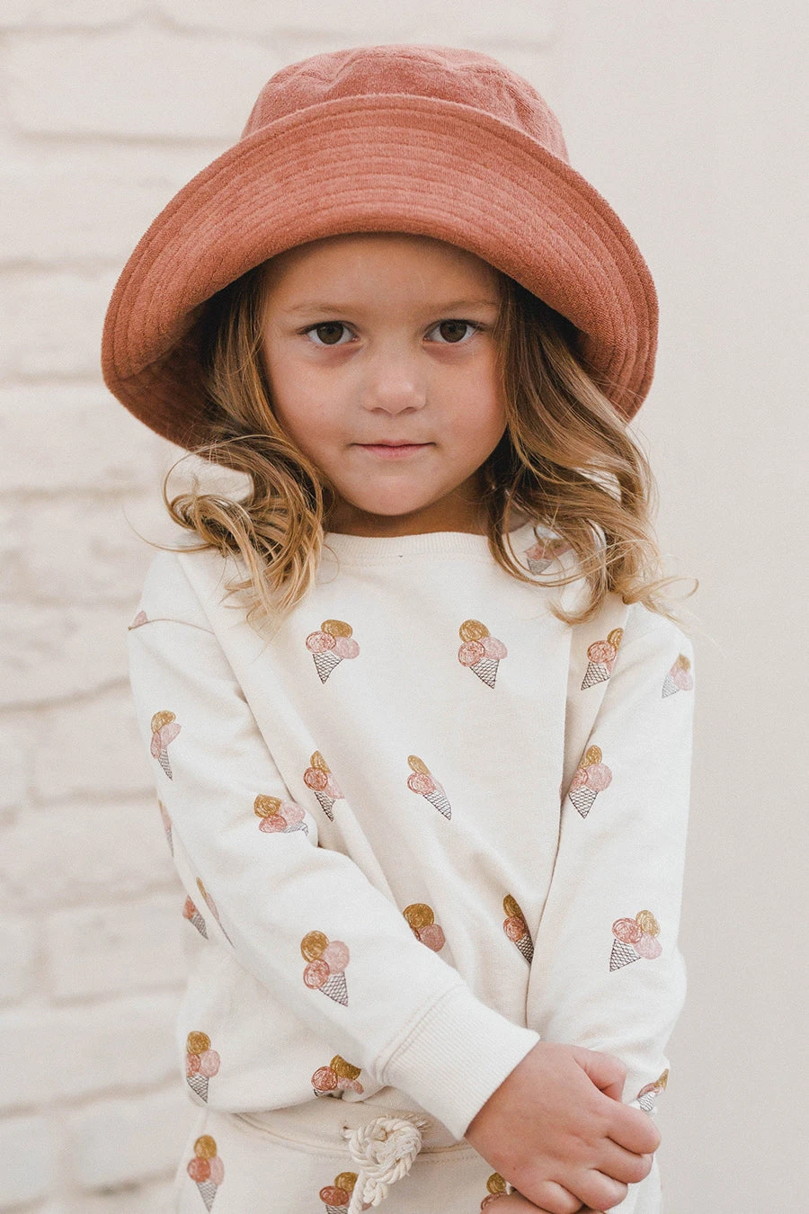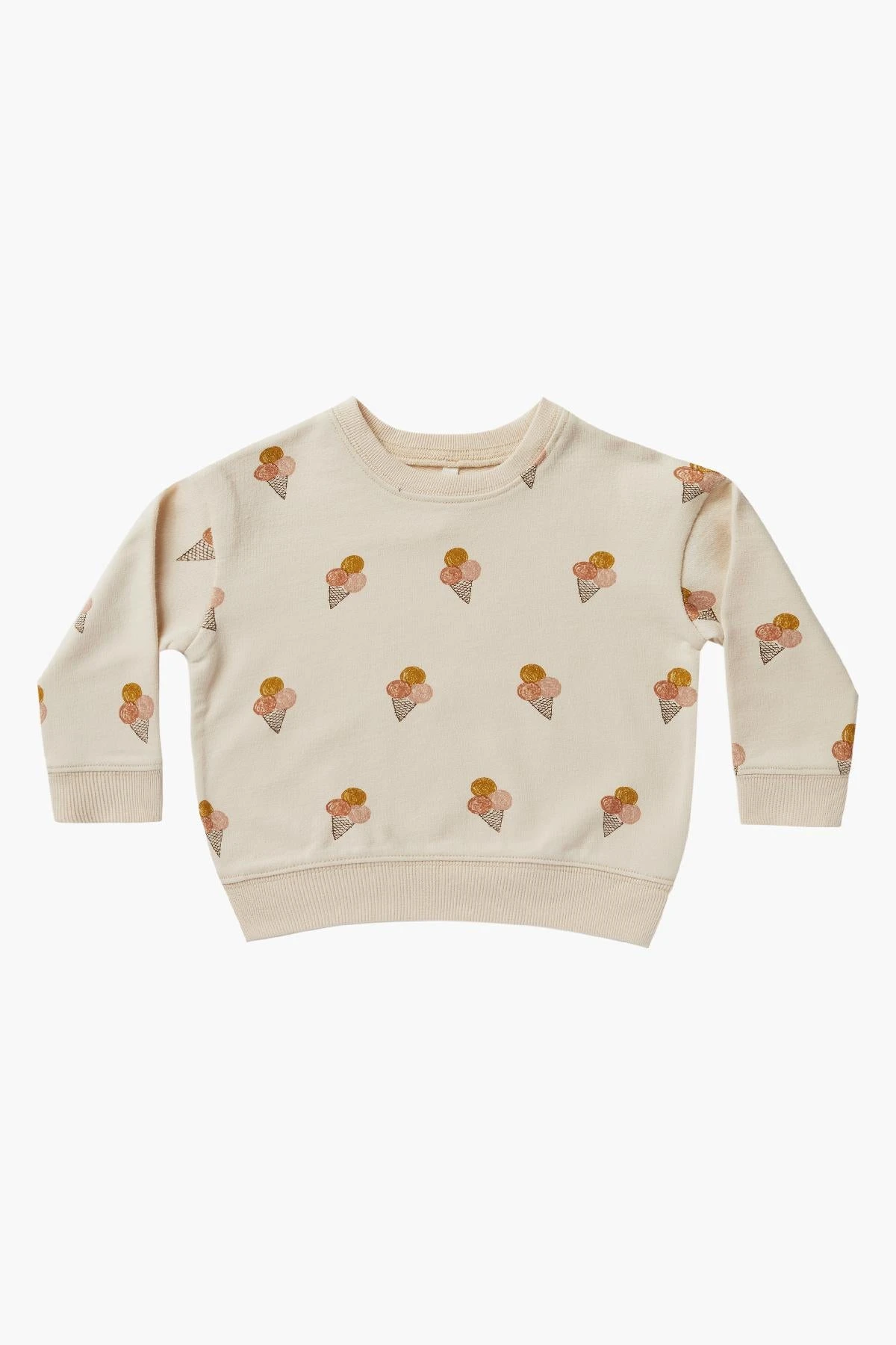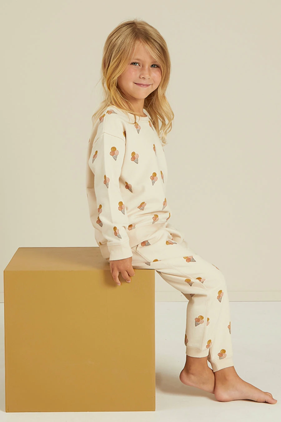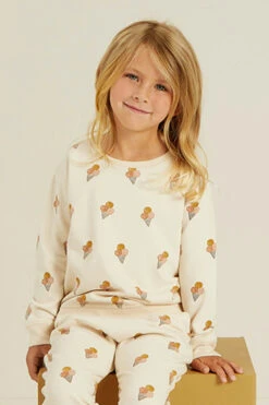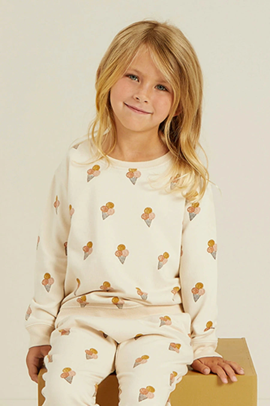 features ice cream graphics on the front and ribbed cuffs. 60% cotton, 40% polyester, machine wash cold.