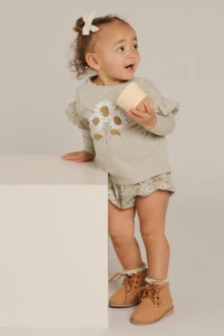 includes a ruffle tee with a bouquet graphic and baby bloomers in a wildflower print. Bloomers are made in a bubble silhouette featuring an elastic waistband and elastic leg openings for comfort and ease. Made of 100% cotton, machine wash cold.