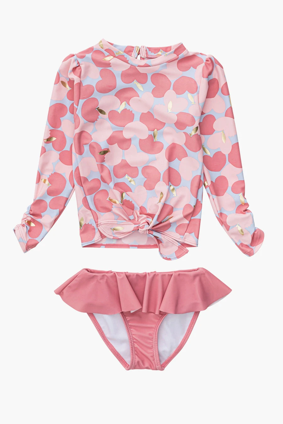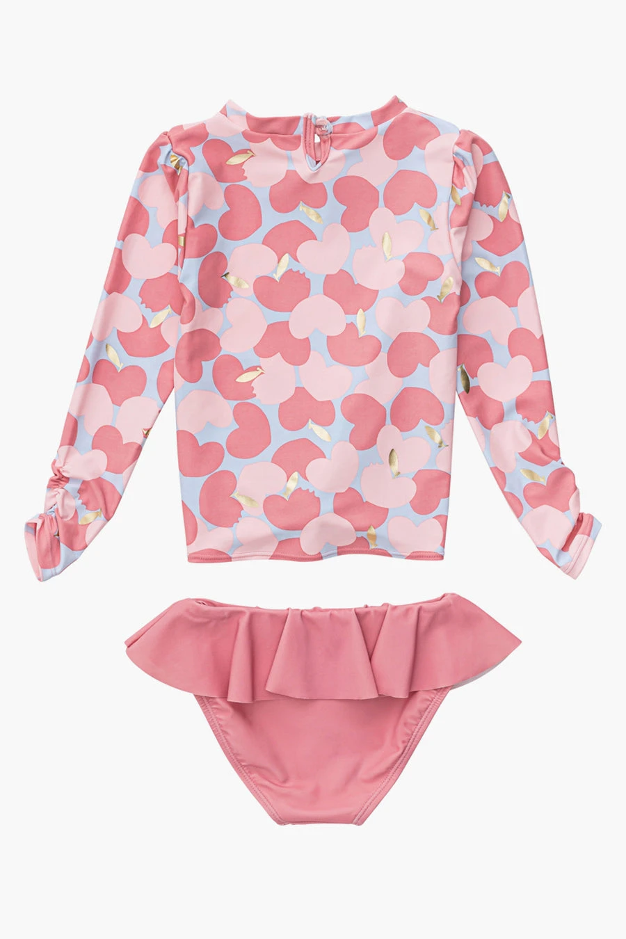 rash guard top and matching ruffle bottoms. The swimsuit features UPF 50+ Sun Protection fabric and the bottoms have an inner drawcord for secure fit. Hand wash or machine wash cold.