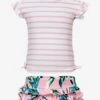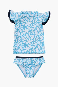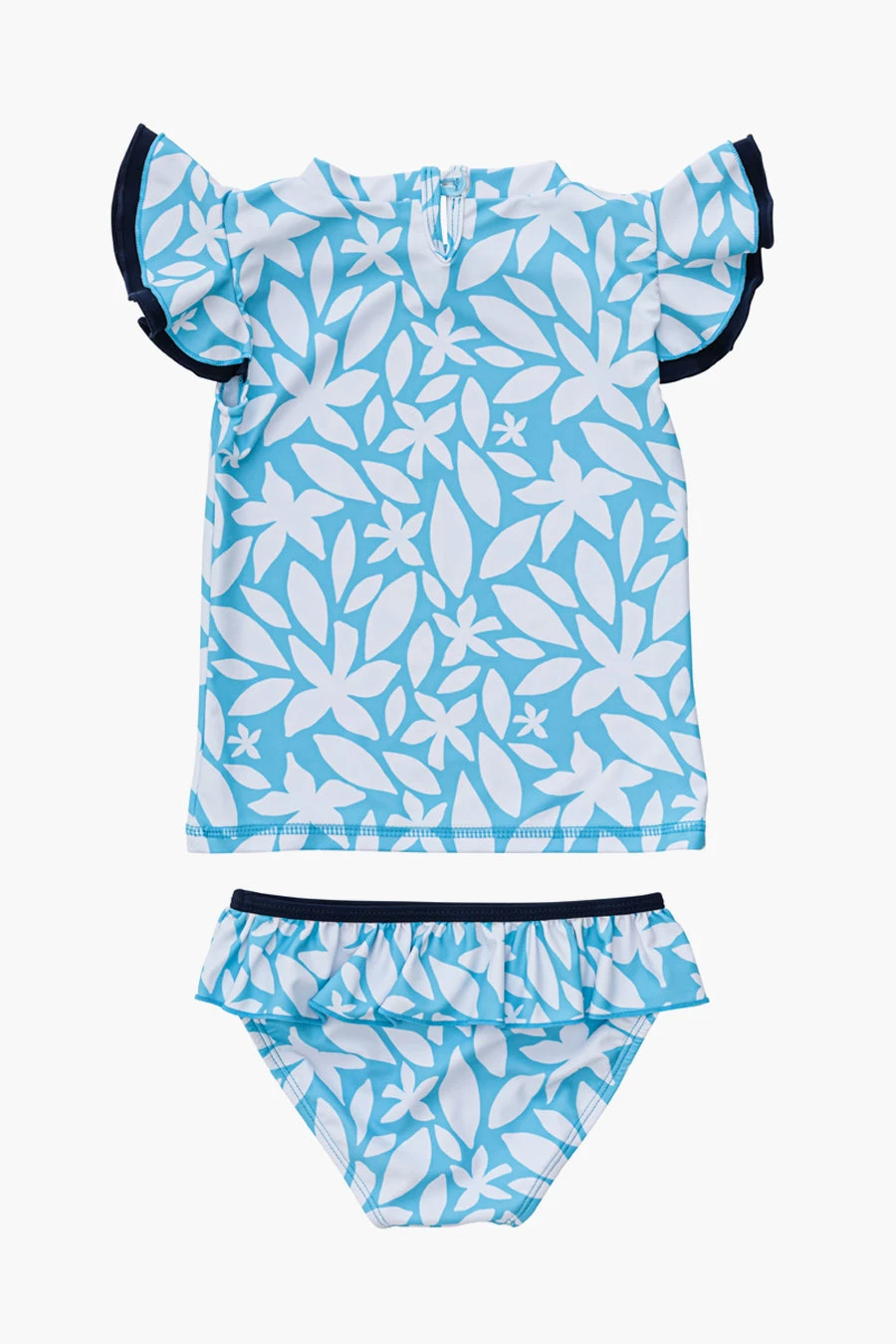 with an adorable rash guard top and matching ruffle bottoms. The swimsuit features UPF 50+ Sun Protection fabric and the rash top has a back neck zip. Hand wash or machine wash cold.