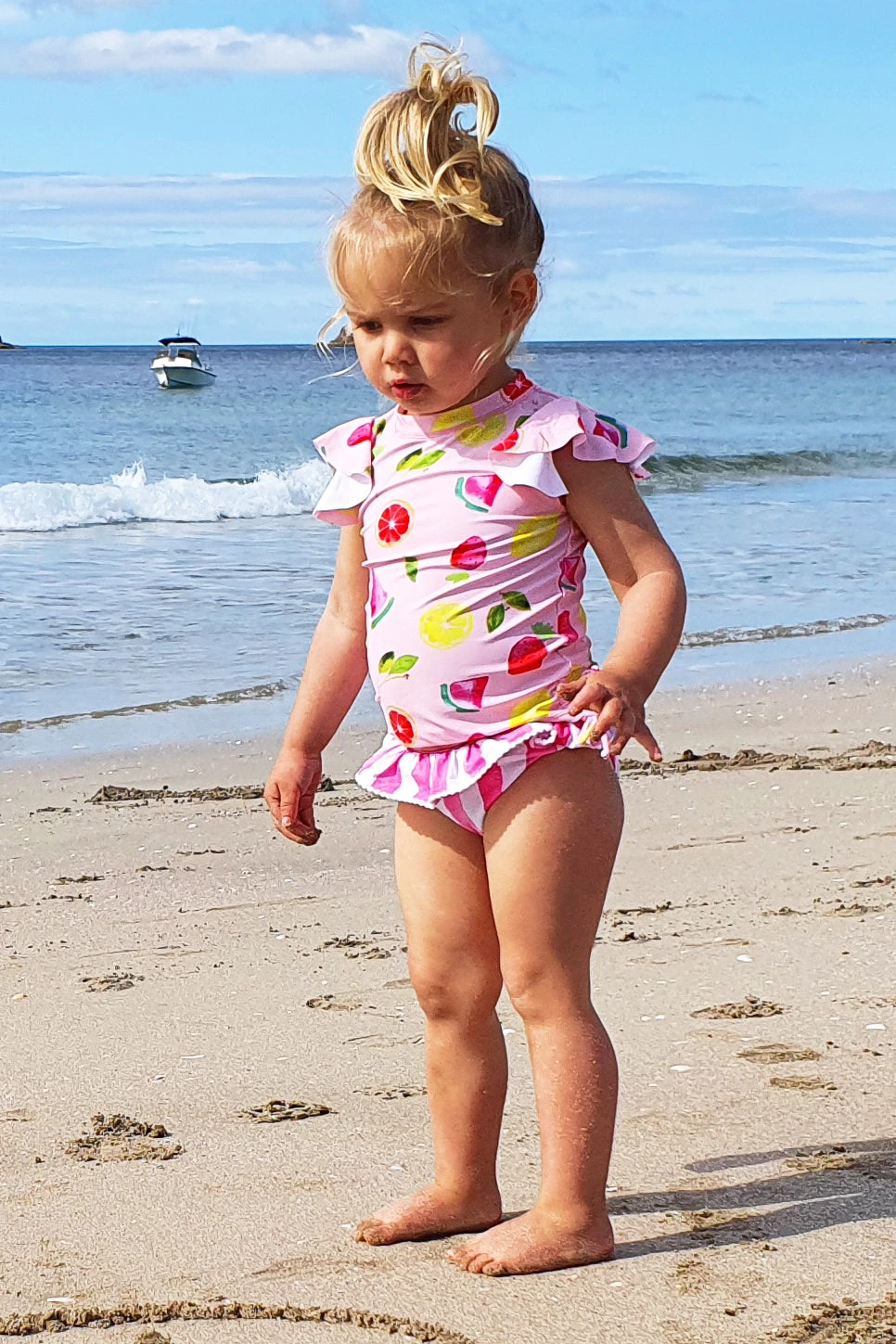 in a fun fruit theme. Made in 80% nylon, 20% elastane, rinse and hang to dry.