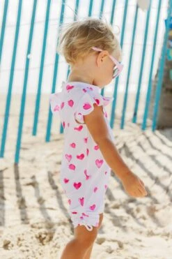 . Watercolor hearts in shades of pink featured on a white background. Made for play both in and out of the water, the ruffled short sleeve
