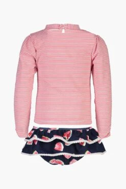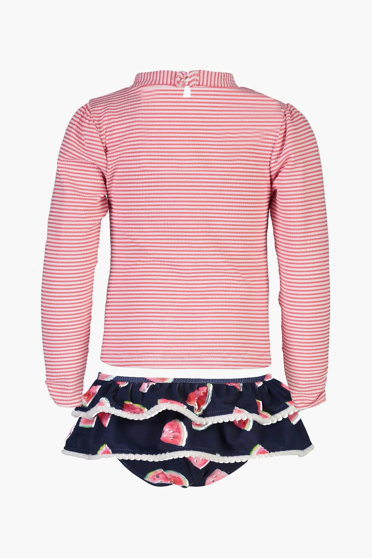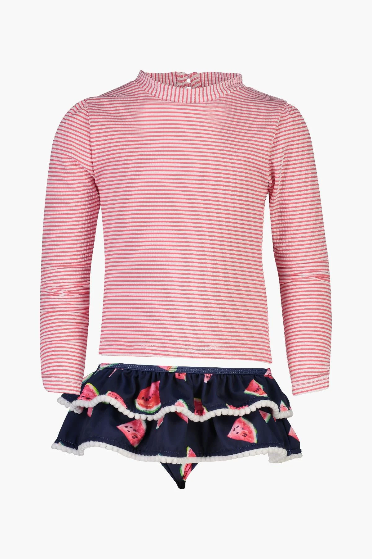 top in seersucker red and white stripe with a ruffle watermelon print bottom and UPF50+ sun protection. Made in 80% nylon, 20% elastane, machine wash.