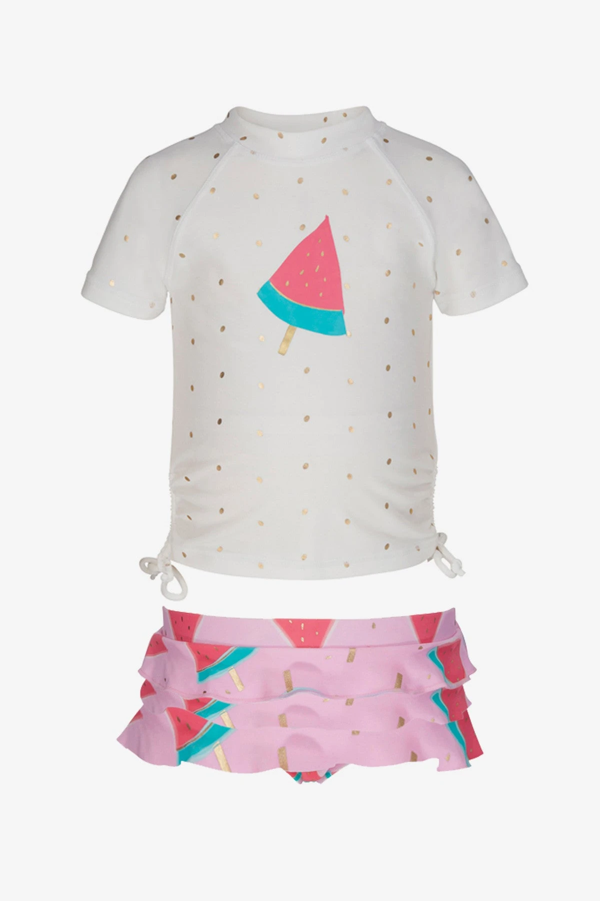 featuring a UV50+ rash top with gold sparkles and a watermelon print. Matching layered ruffle