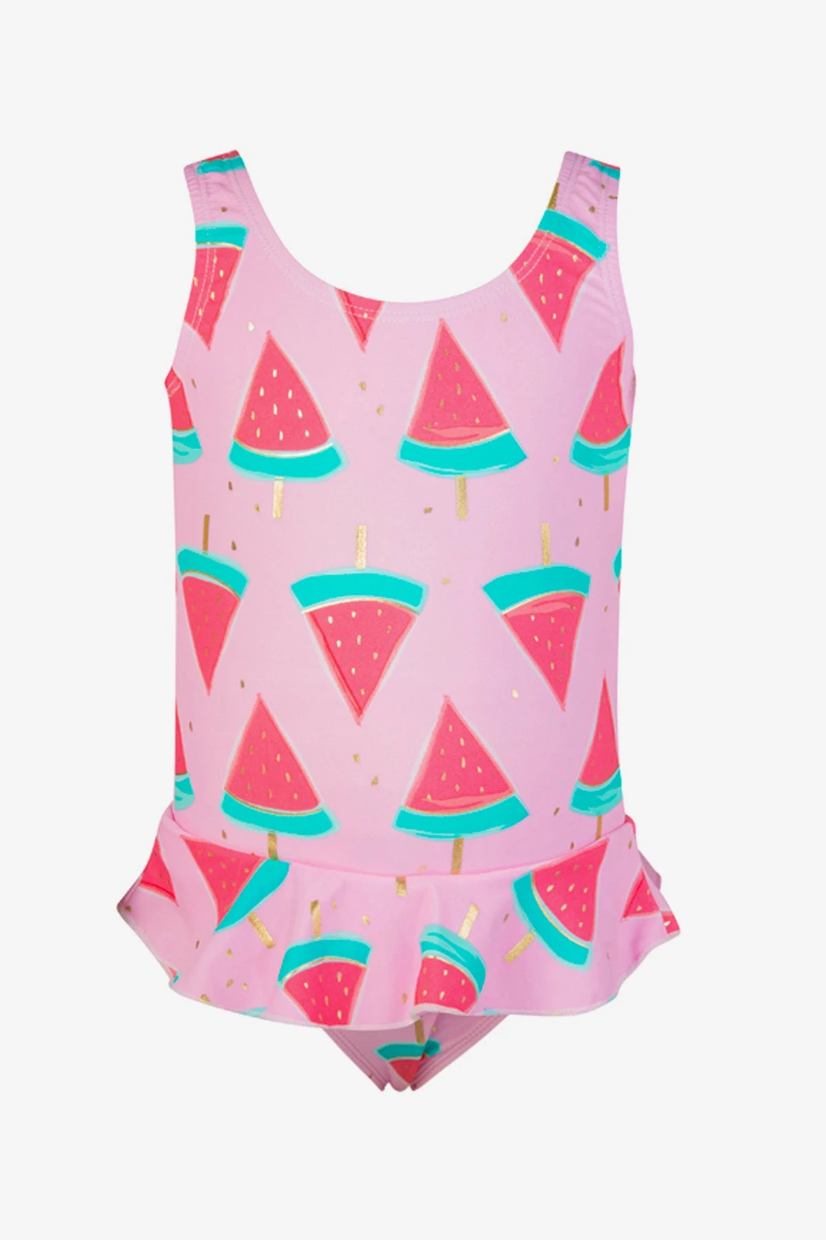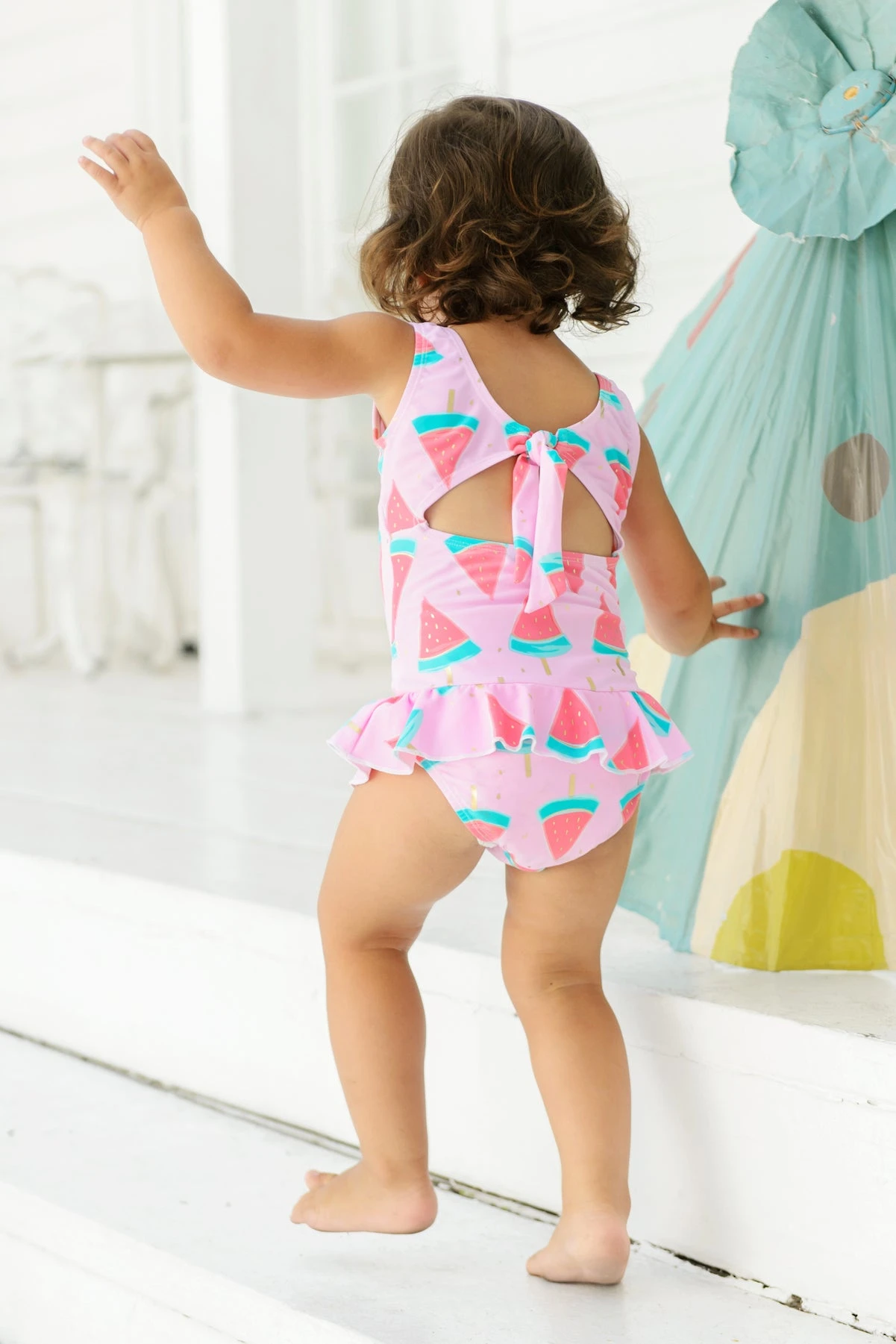 . Leotard front with soft back tie and all round ruffle makes this the cutest