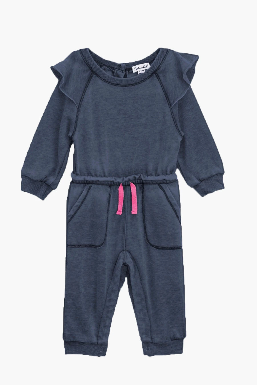 Jumpsuit is a sweet baby girls jumpsuit featuring shoulder ruffles, an elastic waistband for comfort and snaps along the inseam and back for easy wear. 60% cotton, 40% jersey, machine wash.