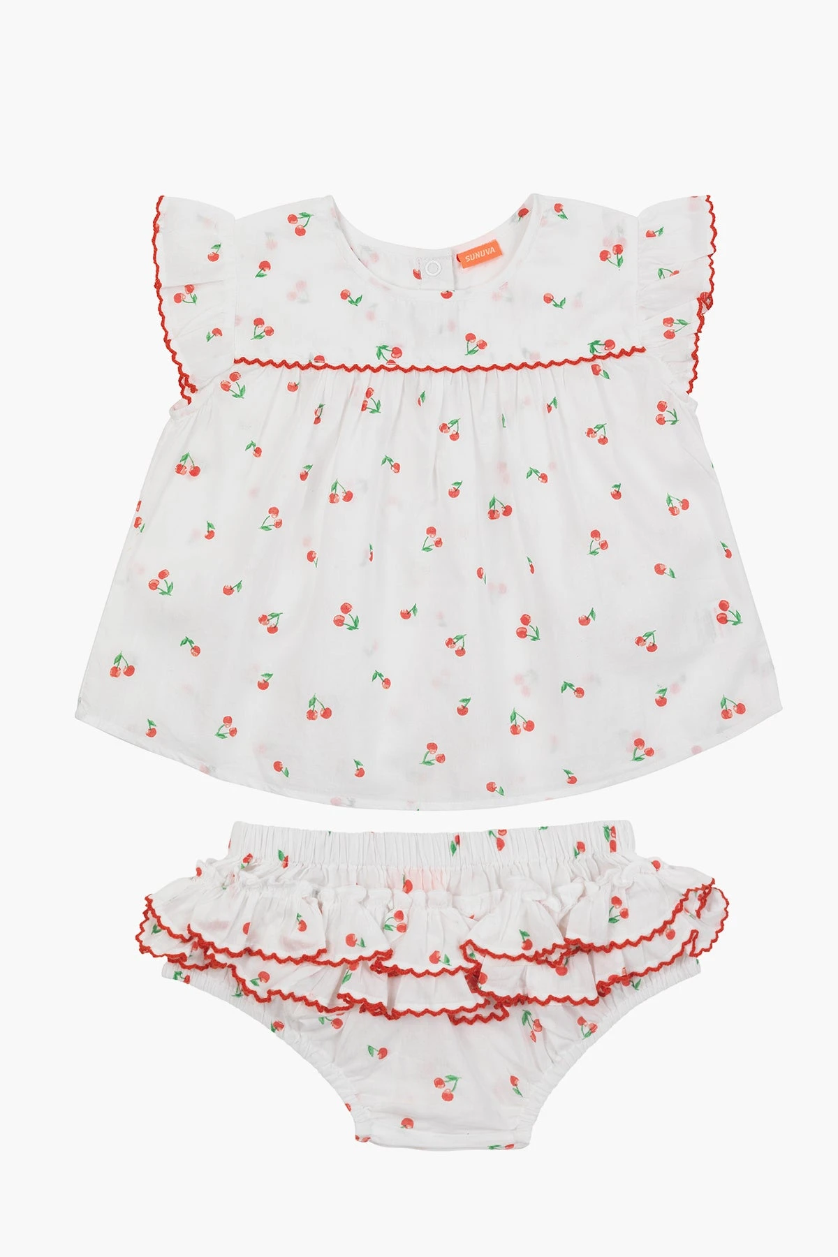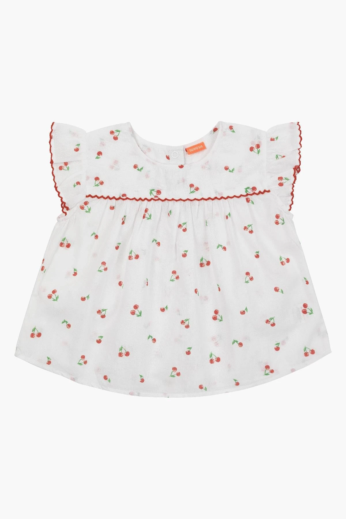 red trim along the sleeves and bodice. 100% cotton, machine wash cold.