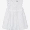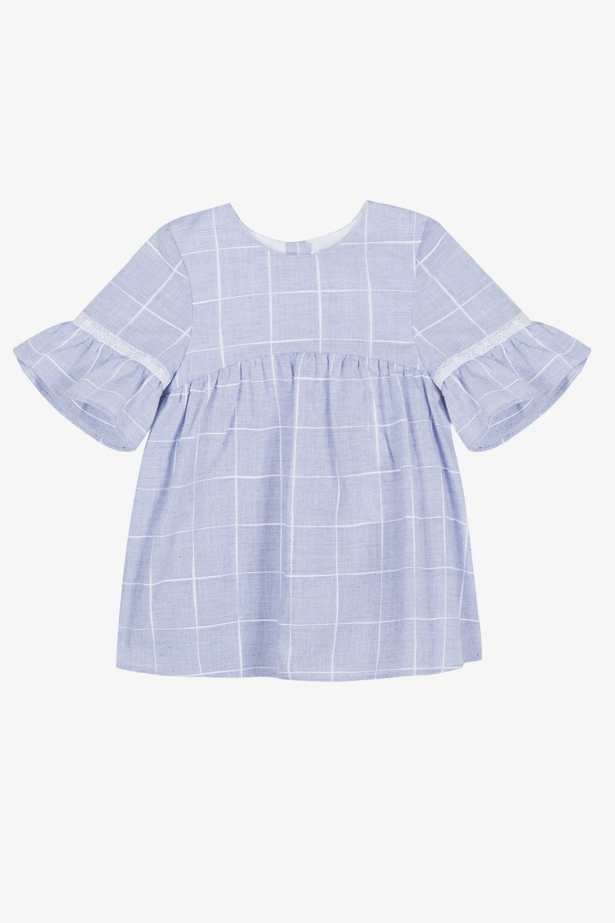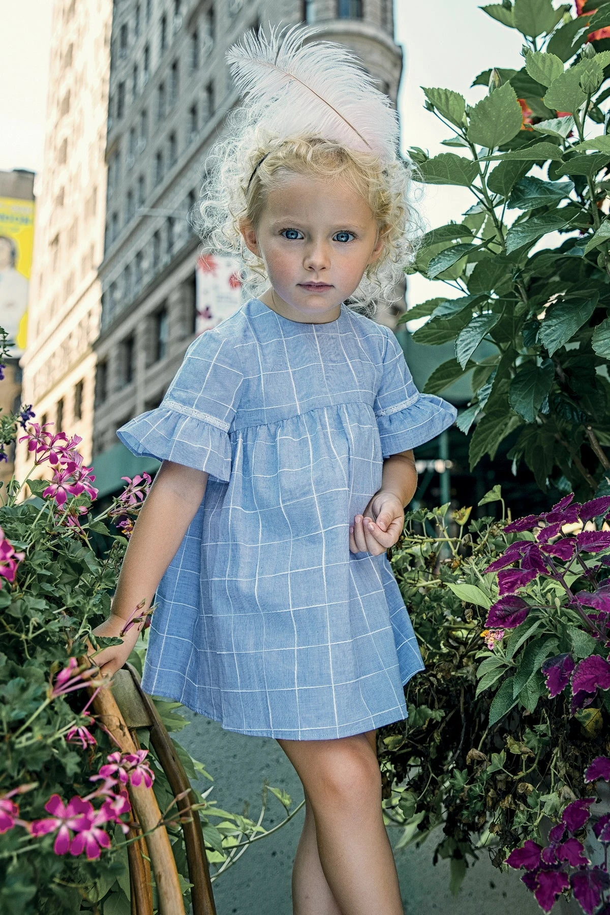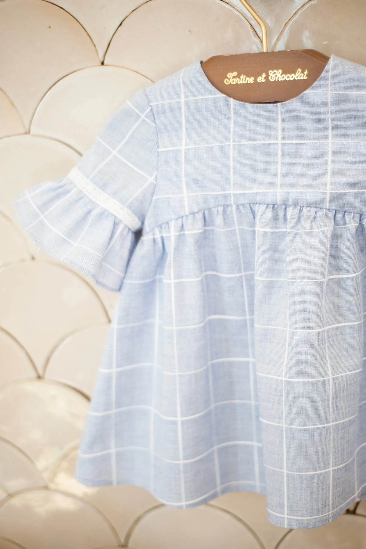 girls dress by Tartine et Chocolat featuring lace around the sleeves. Features 3/4 bell sleeves and a zippered back. 100% cotton, fully lined, machine wash, lay flat to dry.